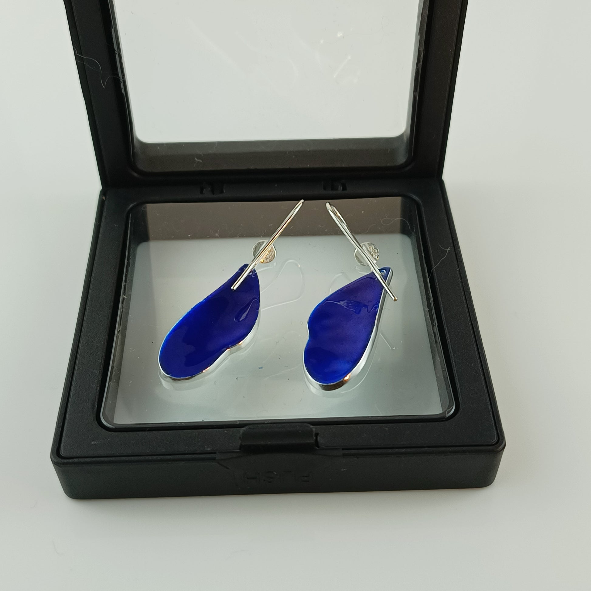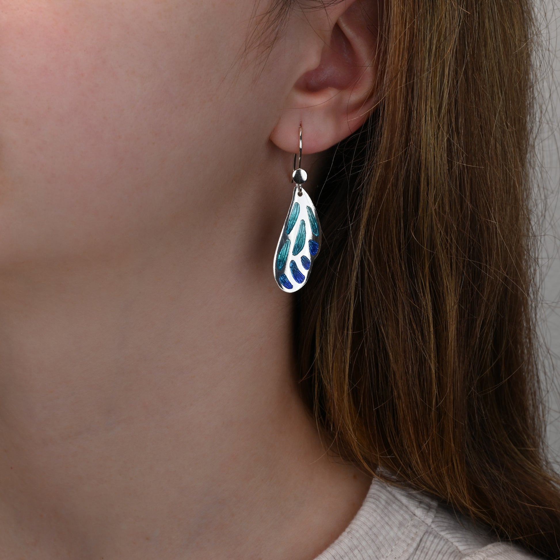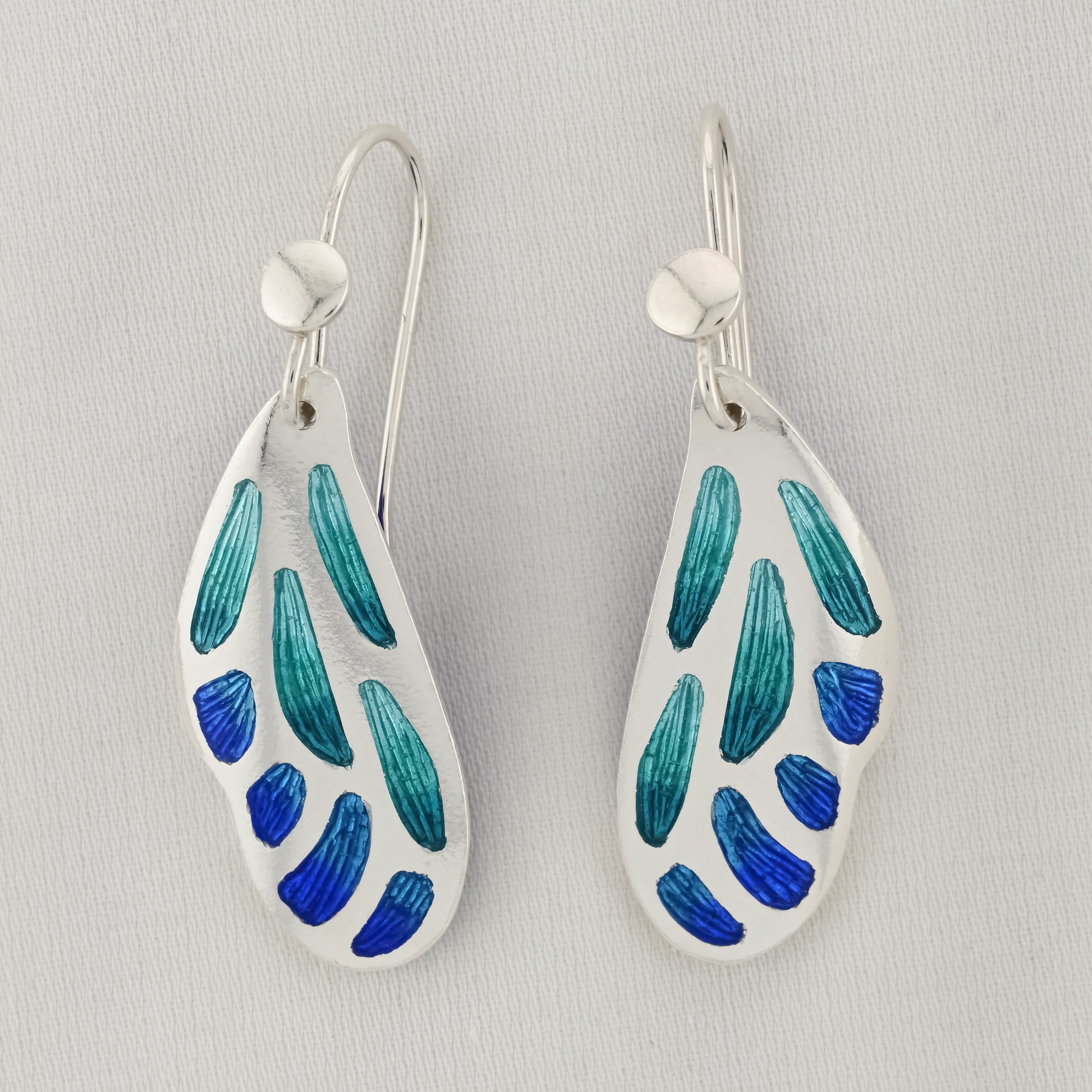 - Materials: Fine silver (999), vitreous aqua and blue enamels, sterling silver ear wires (925)