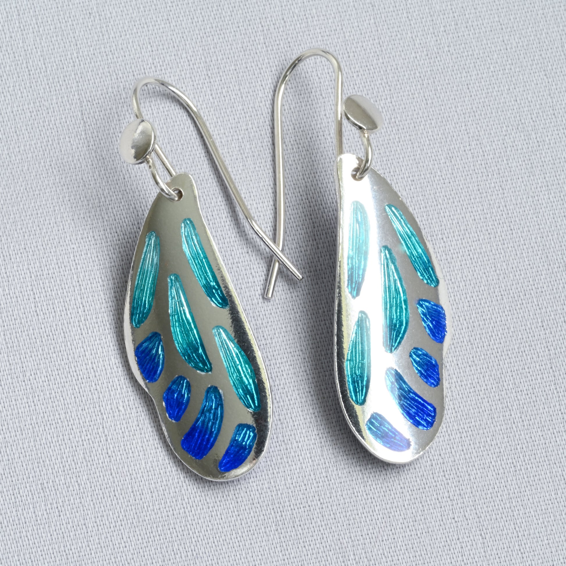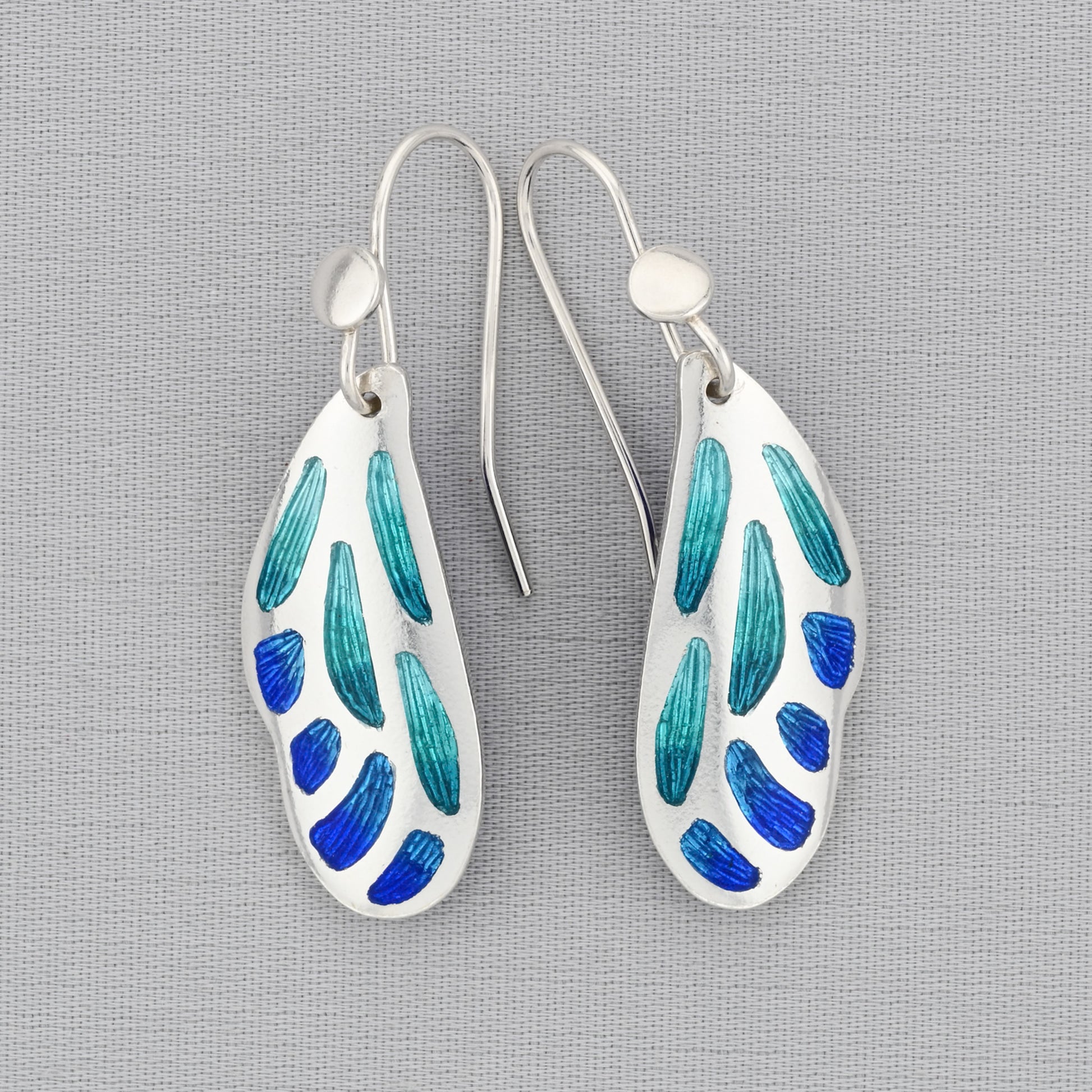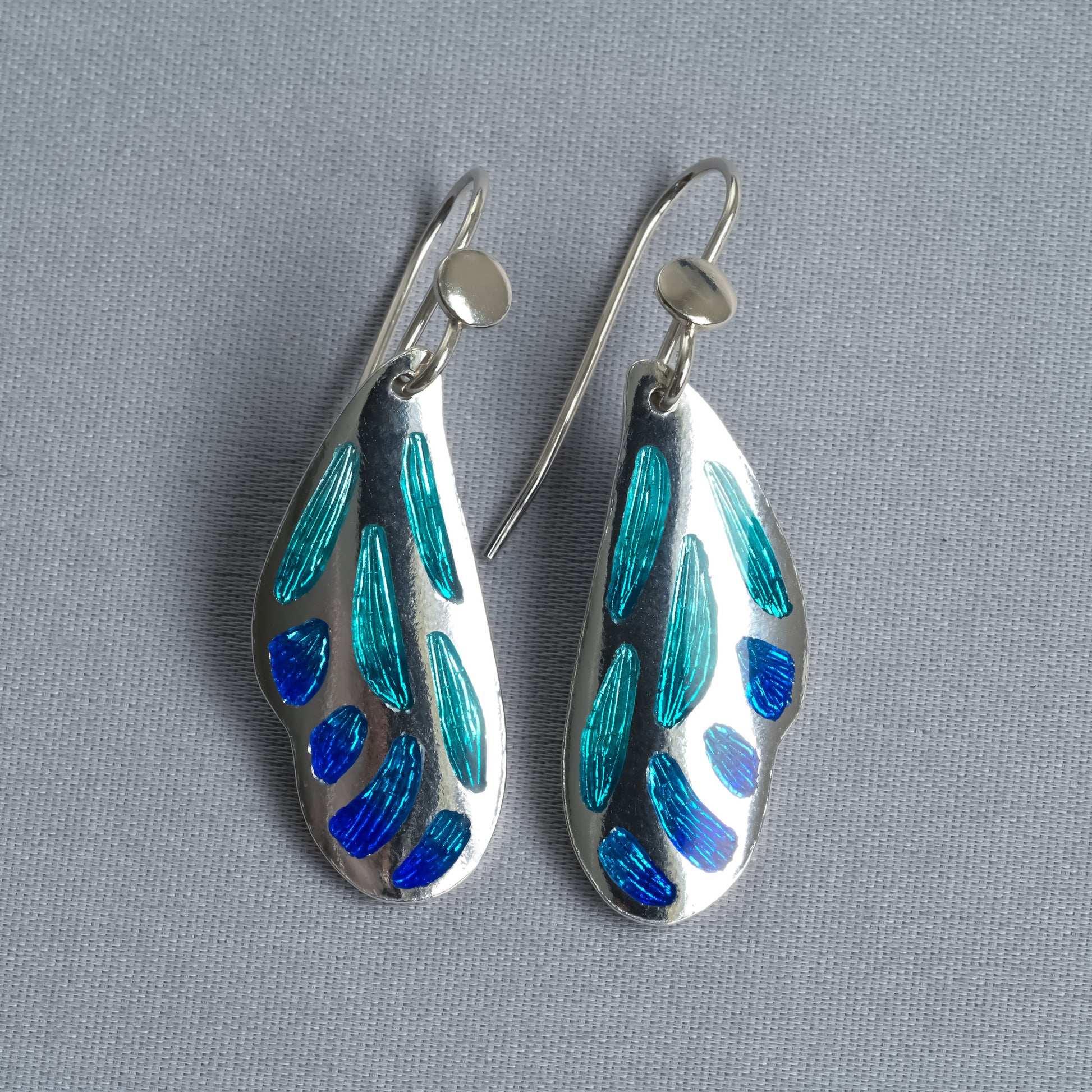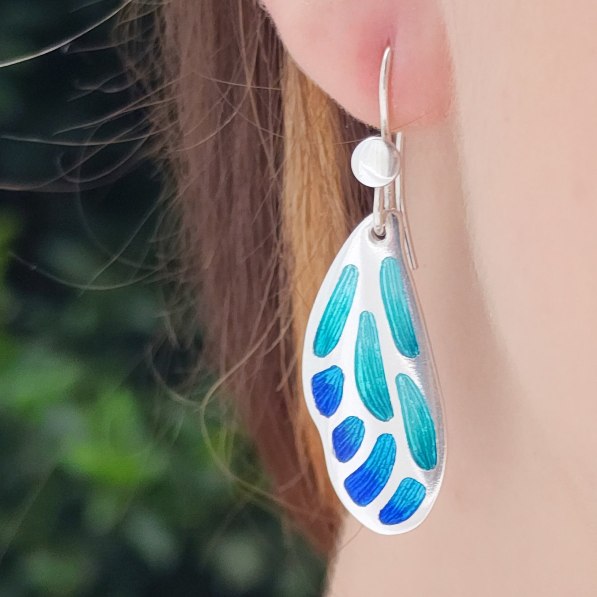 Introducing the "Butterfly Wing Earrings" - a stunning blend of artistry and nature. These wonderfully and unusually shaped earrings were made using the champlevé enameling technique. Inspired by the flutter of tropical butterflies' wings, they feature vitreous aqua and blue enamels on fine silver (999), complemented by sterling silver (925) ear wires.