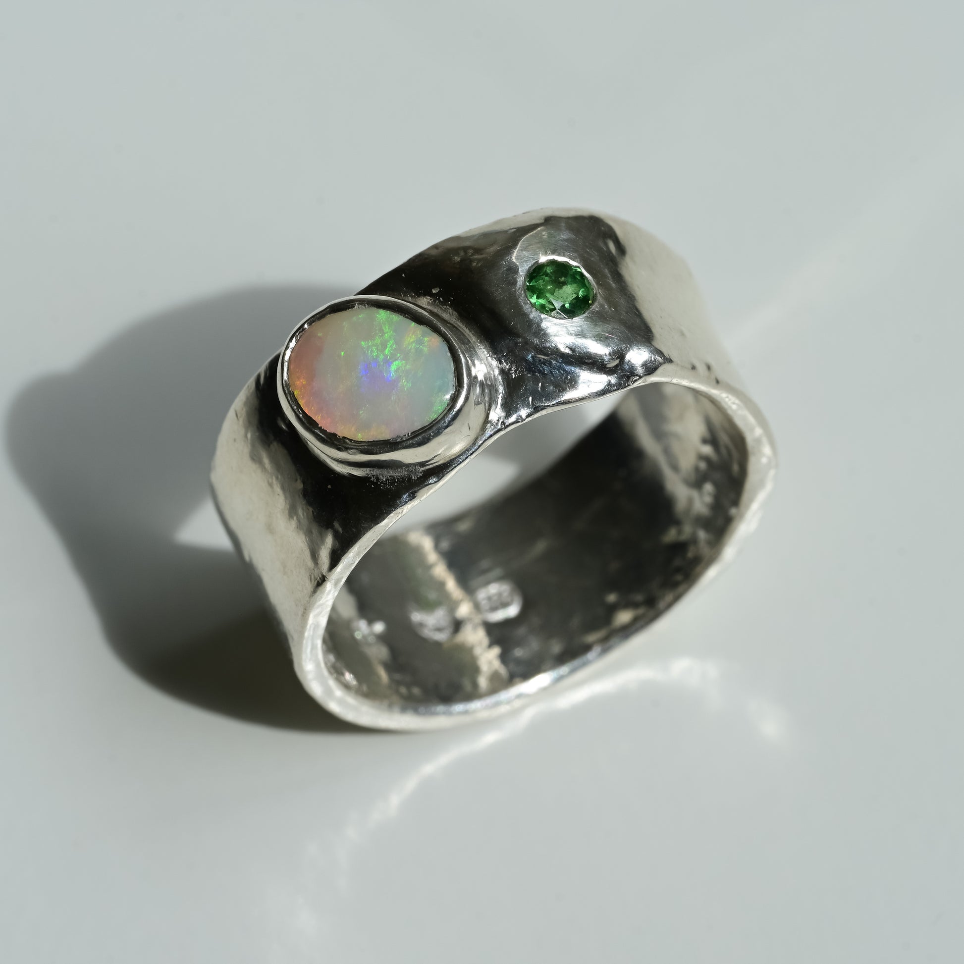 Australian Opal Melted Silver Ring with green tsavorite garnet