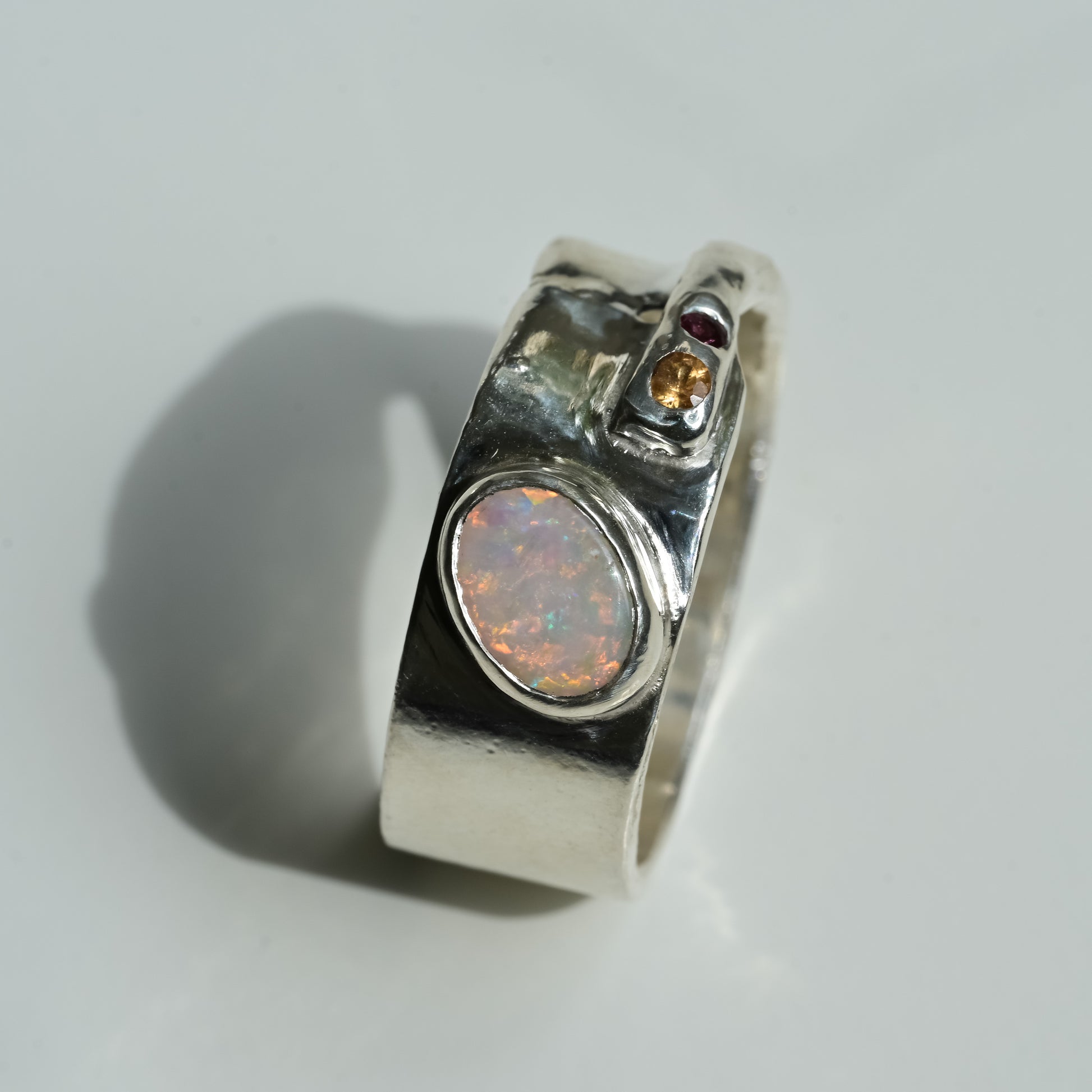 Australian Opal Melted Silver Ring with tourmaline and peach sapphire