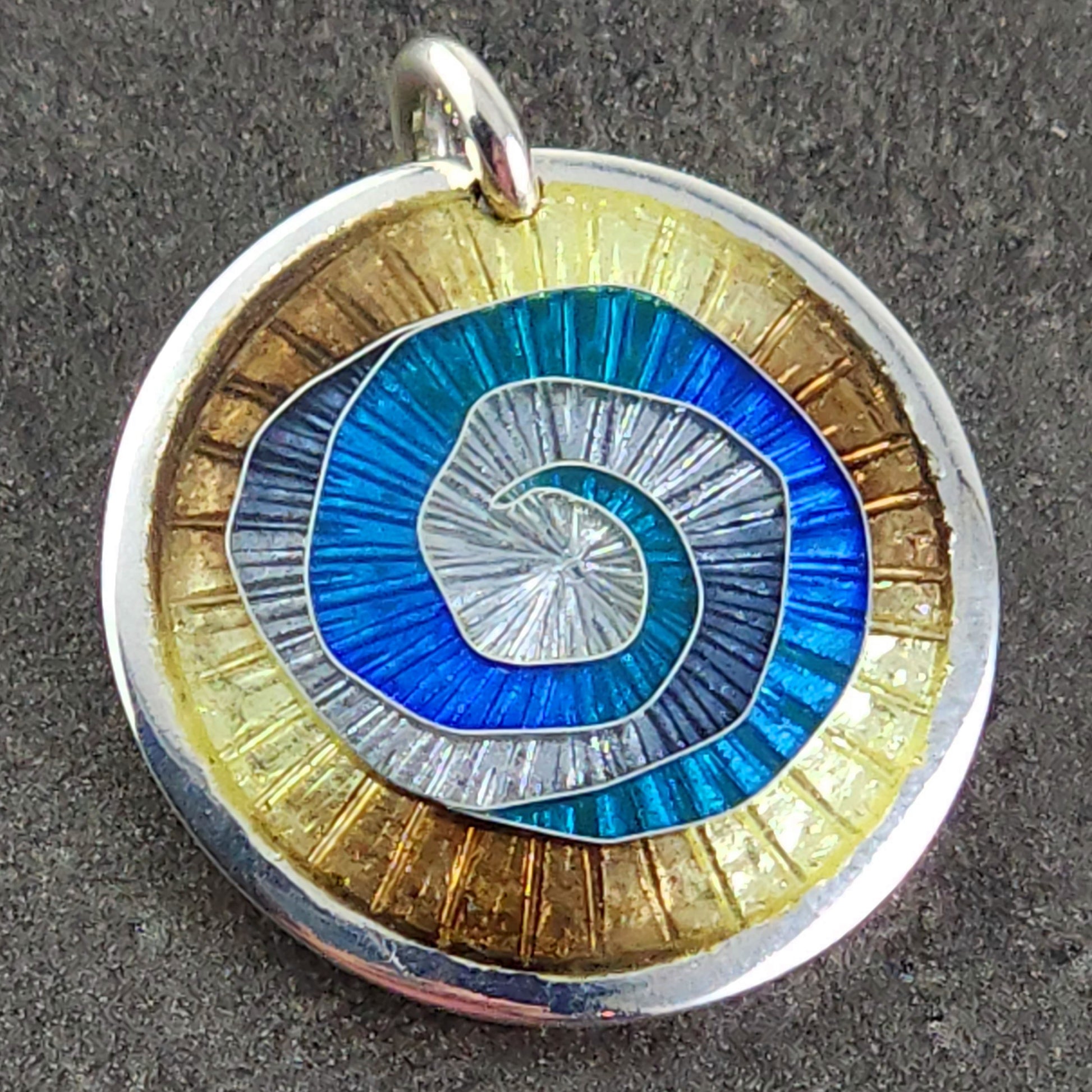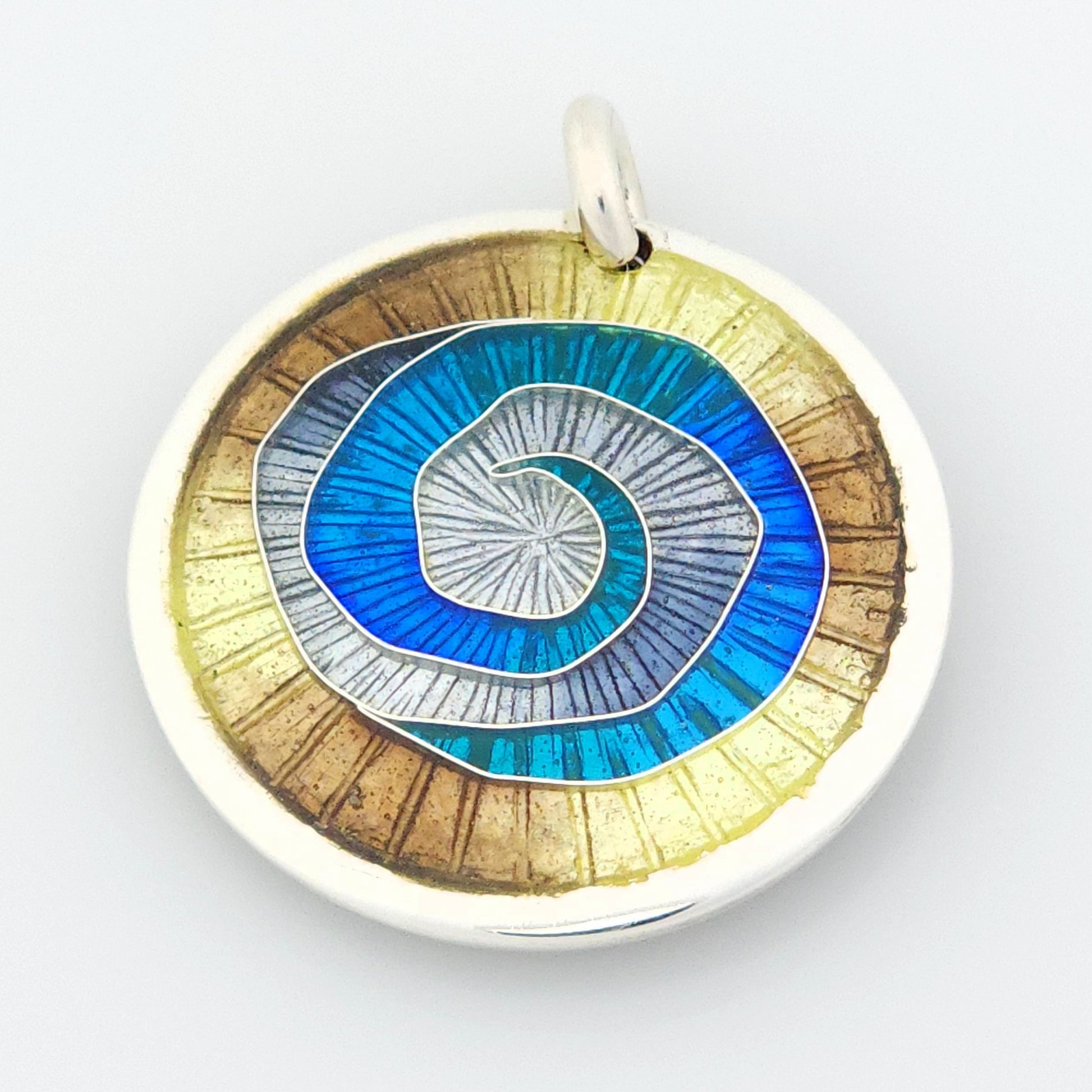 This exquisite pendant features a unique swirl pattern in shades of blue, grey, and yellow, created with a delicate cloisonné vitreous enameling technique on a fine silver (999) base, enhanced with a sterling silver bail. Elegant and sophisticated, this beautiful piece is sure to add a luxurious touch to any ensemble. This pendant won the first prize in Australia wide competition in 2023.