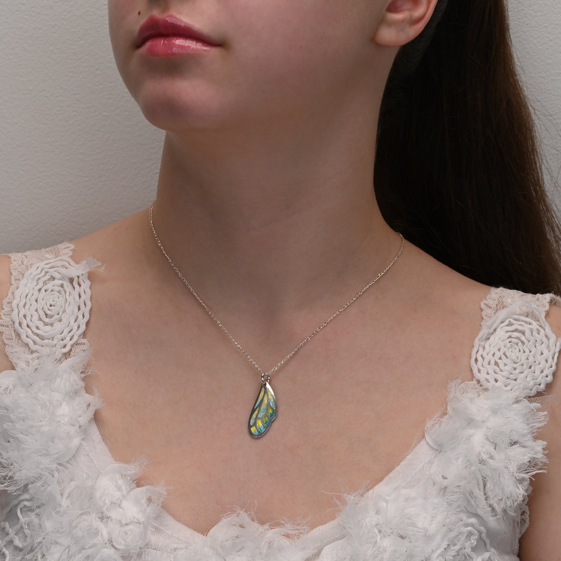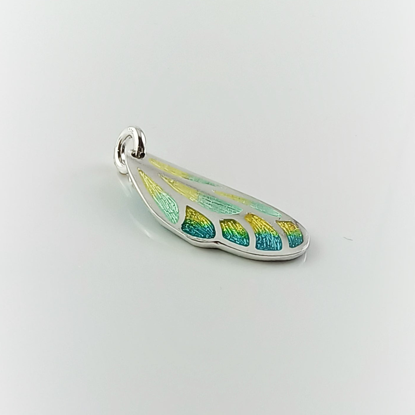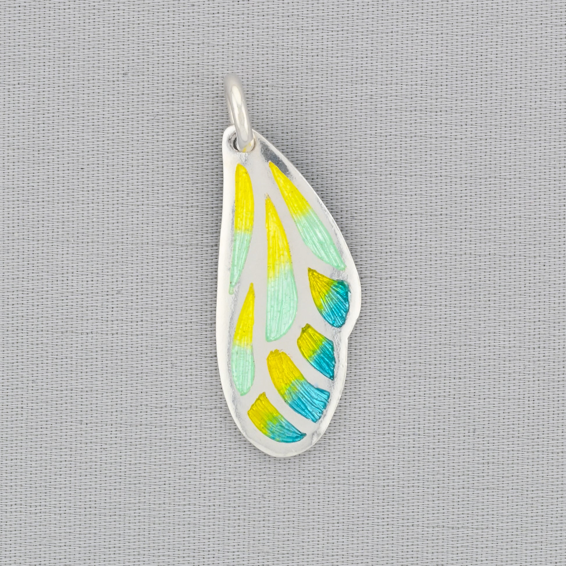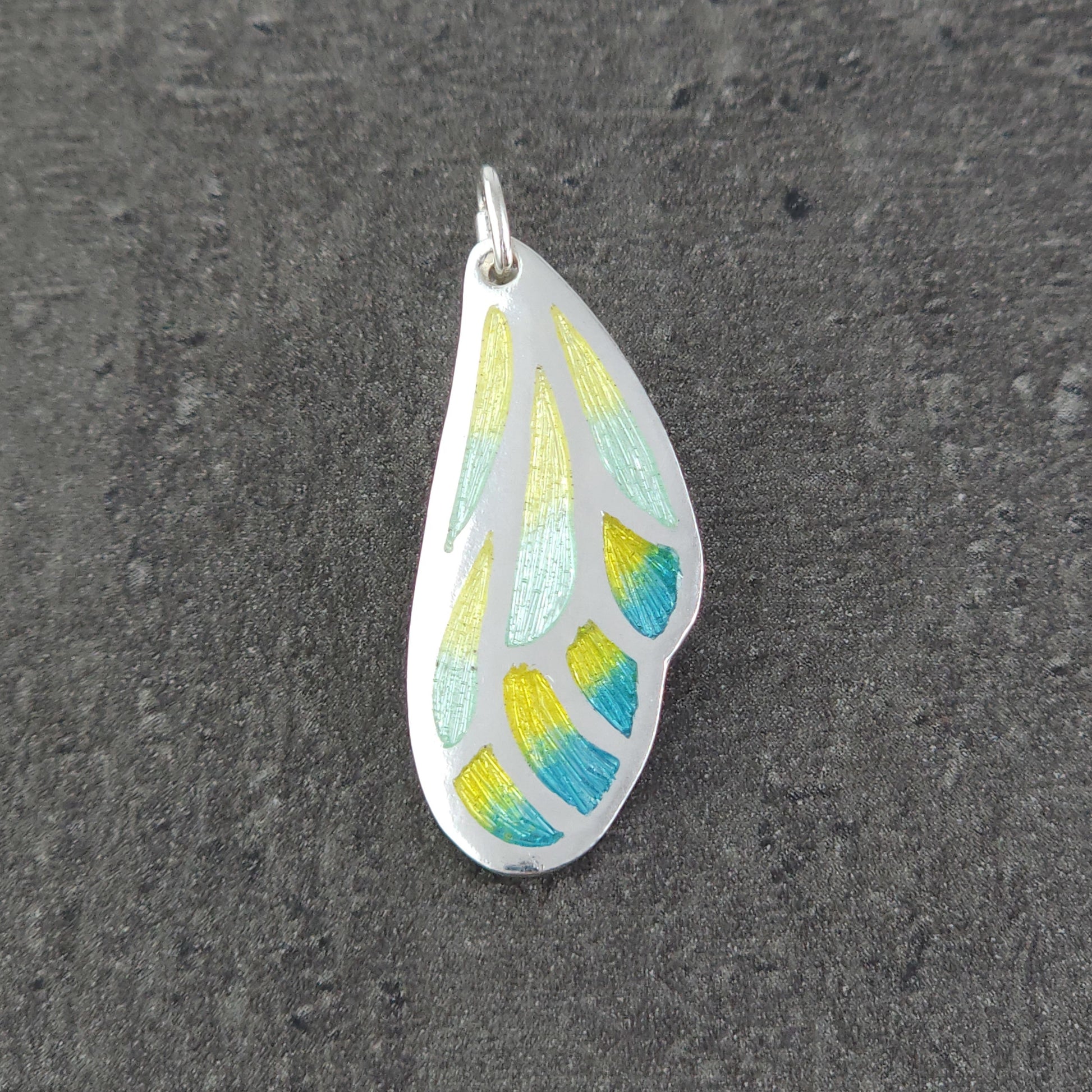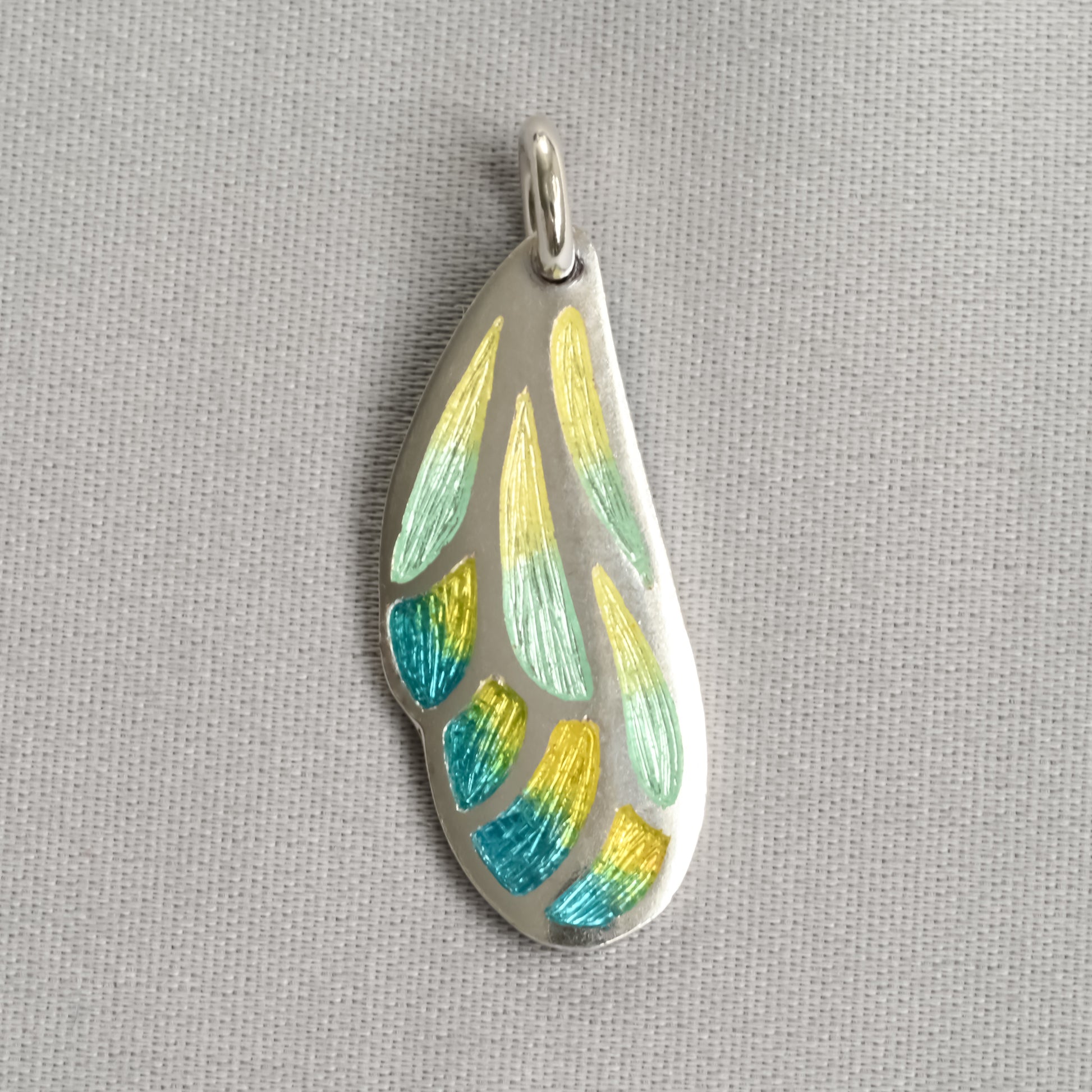 The "Butterfly Wing Pendant" is an award-winning piece that won first prize in a 2022 competition. This exquisite pendant is handcrafted with champlevé vitreous yellow and aqua enamels. Celebrate the beauty of craftsmanship with this stunning pendant, a true testament to exceptional design and artistry. Elevate your jewellery collection with this unique and award-winning piece.