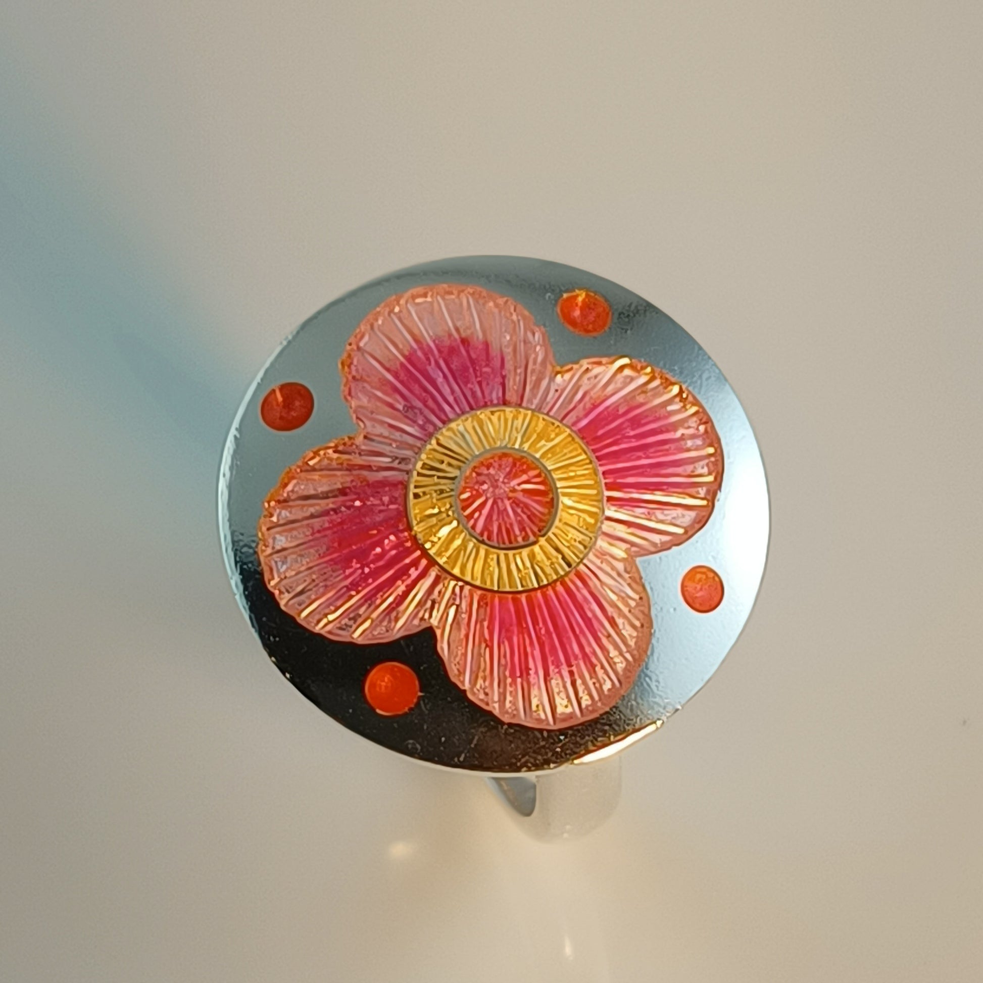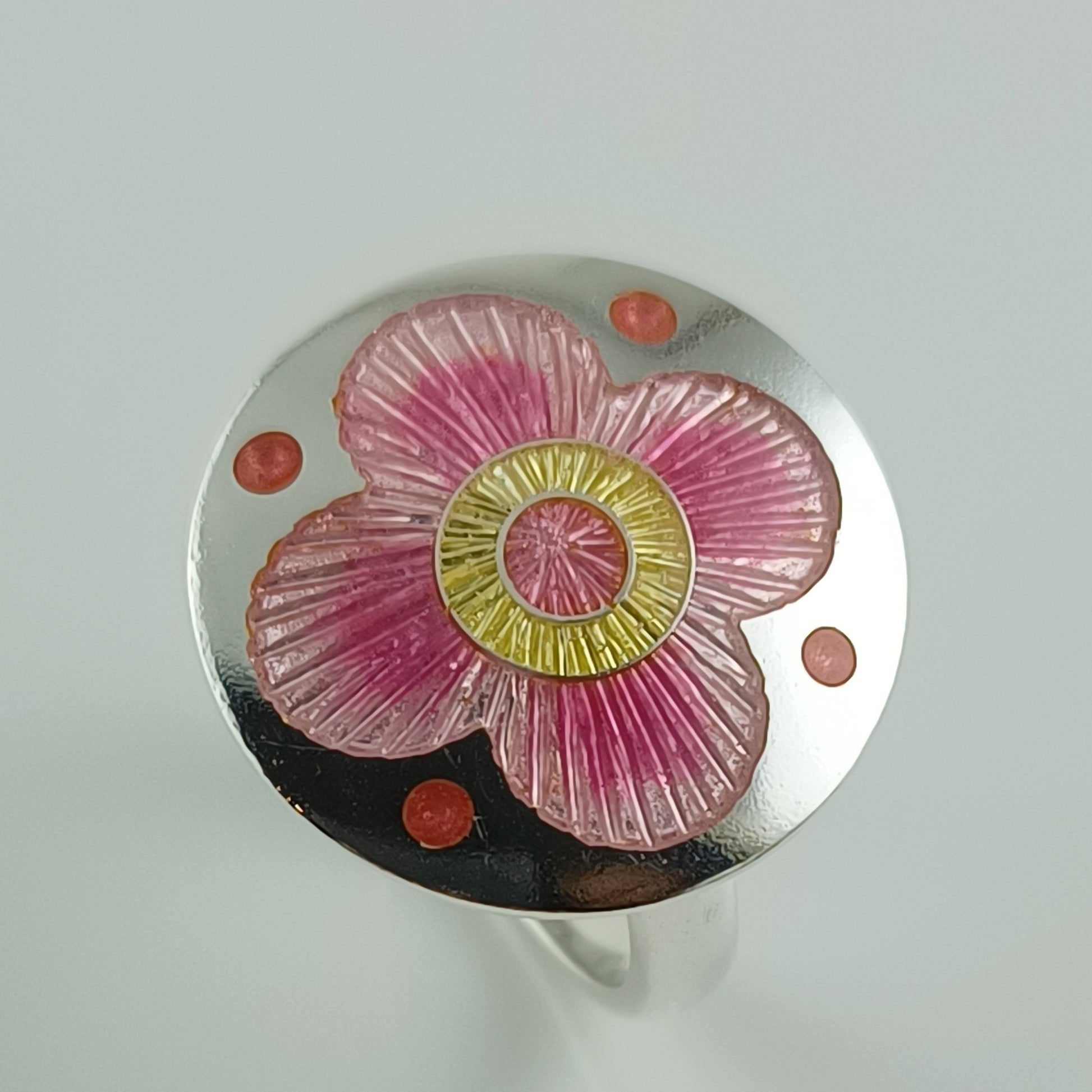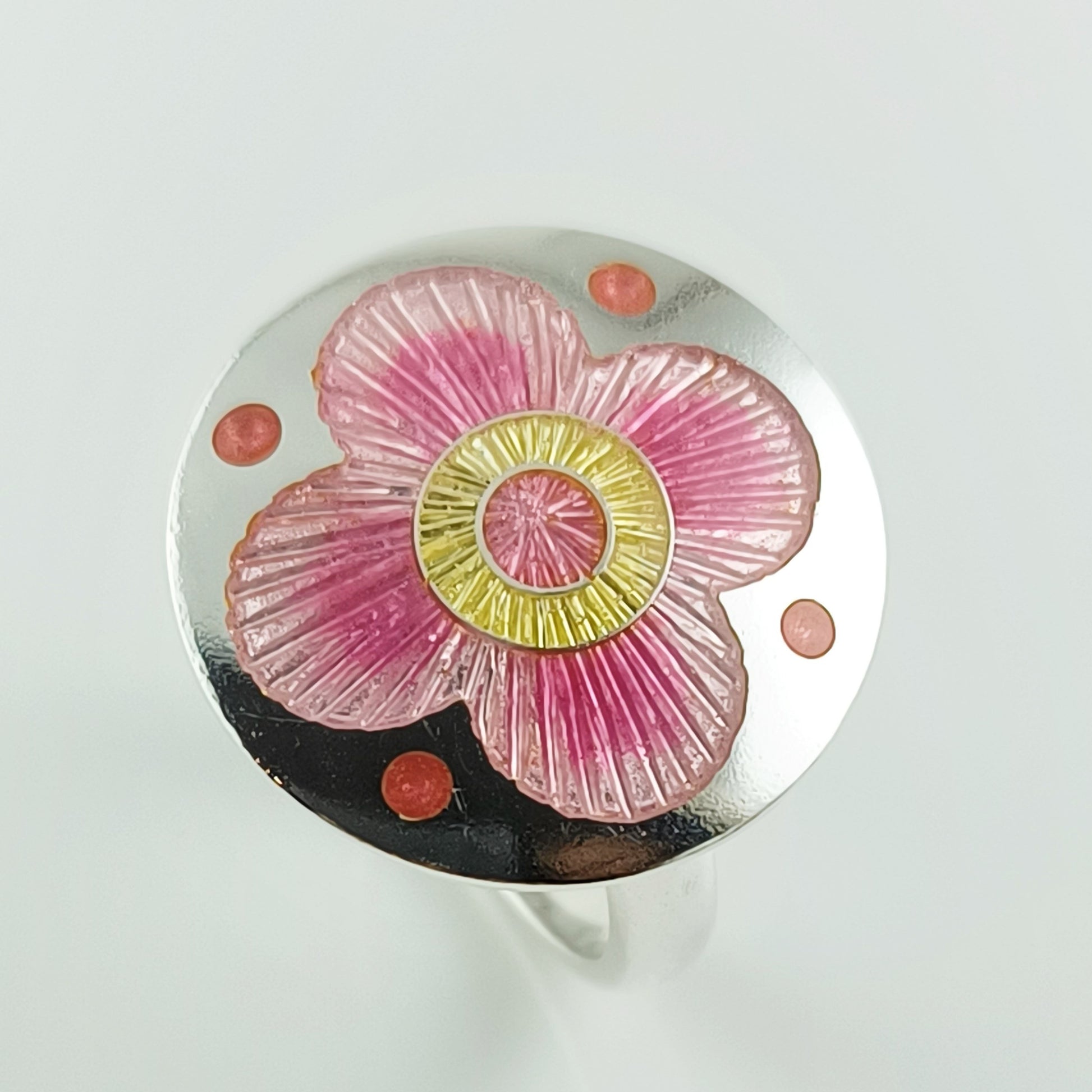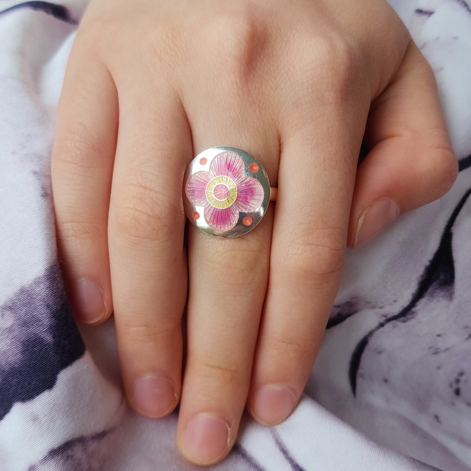 "Cherry Blossom Enamel Ring" is a truly unique piece of wearable art. This exquisite ring features a fine silver circle, beautifully detailed with a cherry blossom design created through the intricate champlevé enamel technique. The vibrant enamel work showcases the delicate petals of the cherry blossom, offering a stunning contrast against the lustrous silver backdrop.