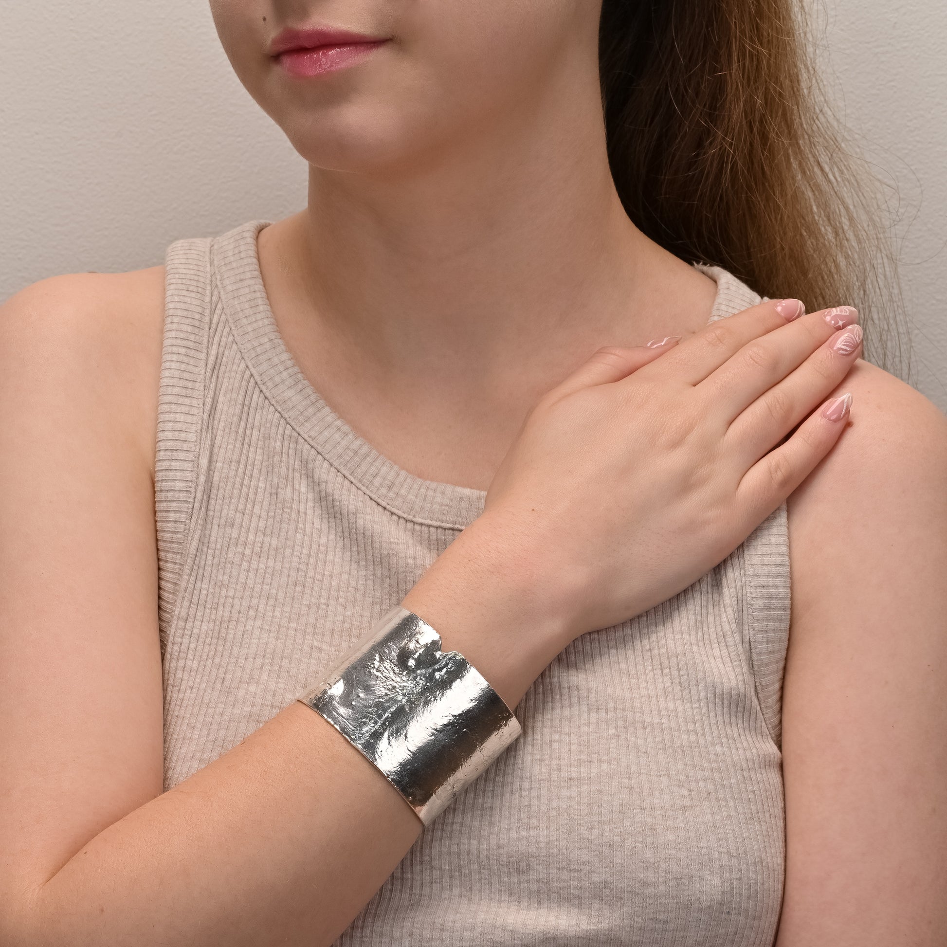 Experience the unique elegance of our Melted Silver Cuff Bracelet, composed of the highest quality 999 fine silver. Known for its bright lustre and durability, this bracelet is not just a piece of jewellery but a lasting treasure. Handcrafted in Australia, its organic and fluid form adds a touch of sophistication and modernity to any outfit.