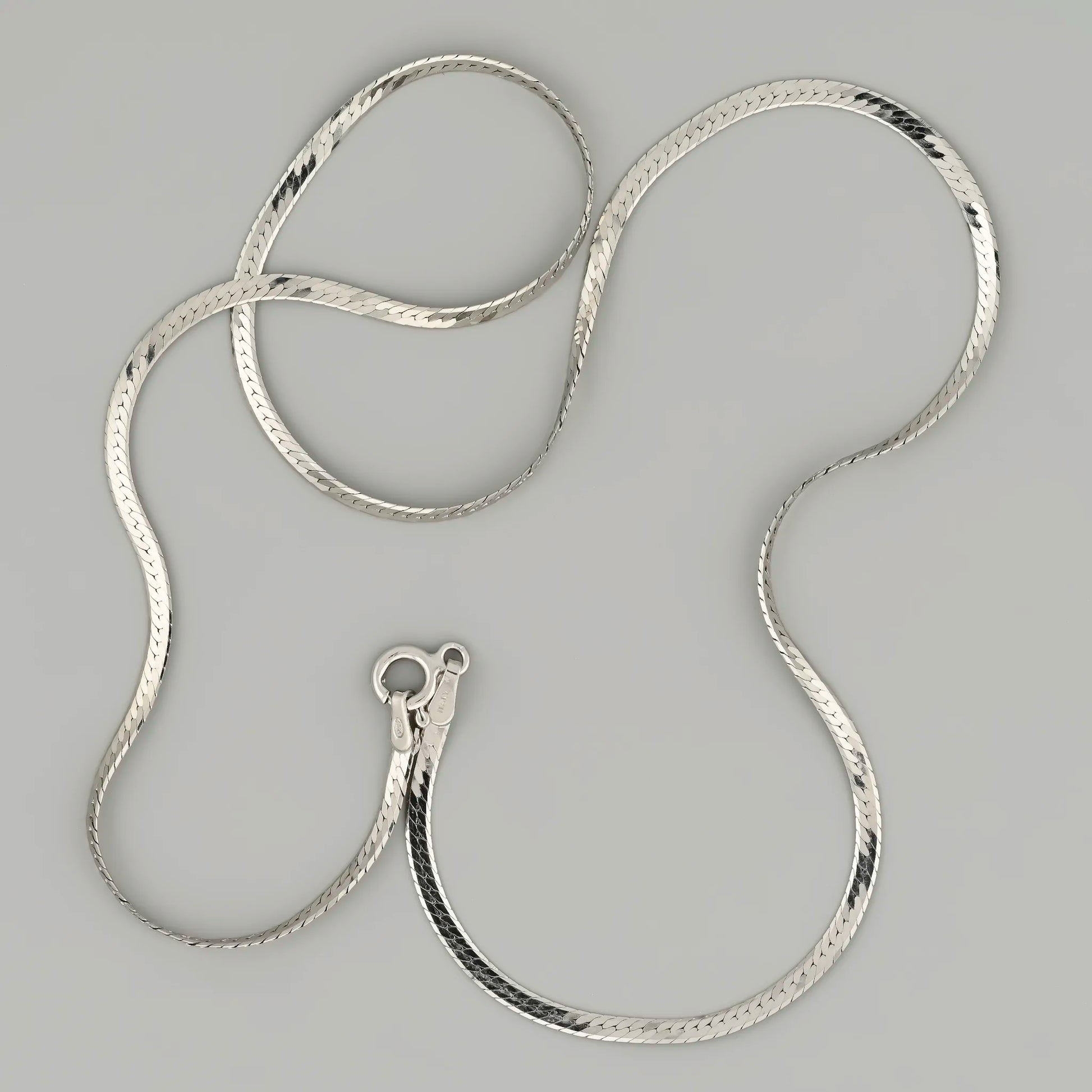 Experience the elegance of the Herringbone Rhodium Plated Silver Chain. This beautifully crafted chain, made from sterling silver (925) and plated with rhodium, offers a refined and polished look. The 2.7mm link size enhances its sleek design, making it an ideal accessory for both everyday wear and special occasions.