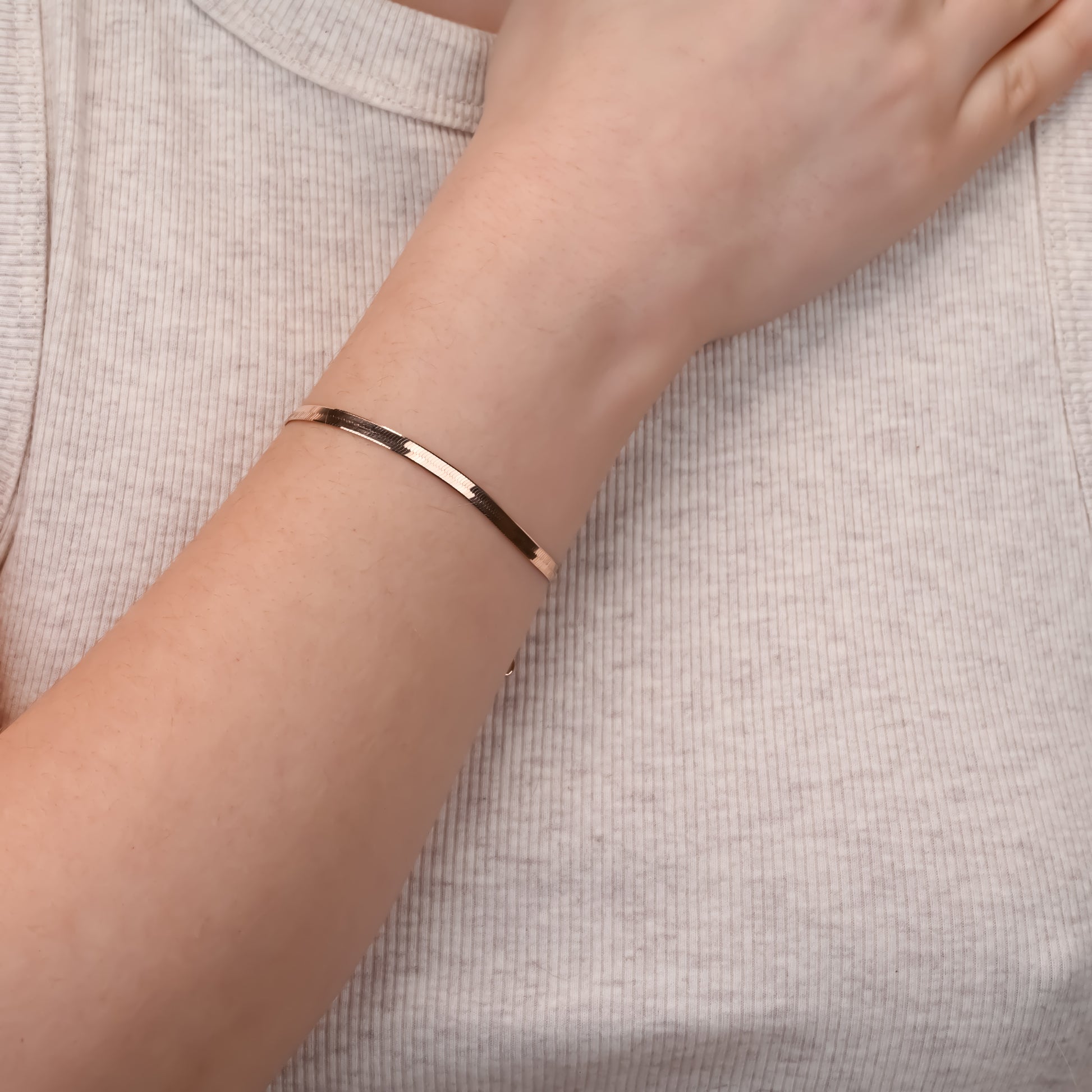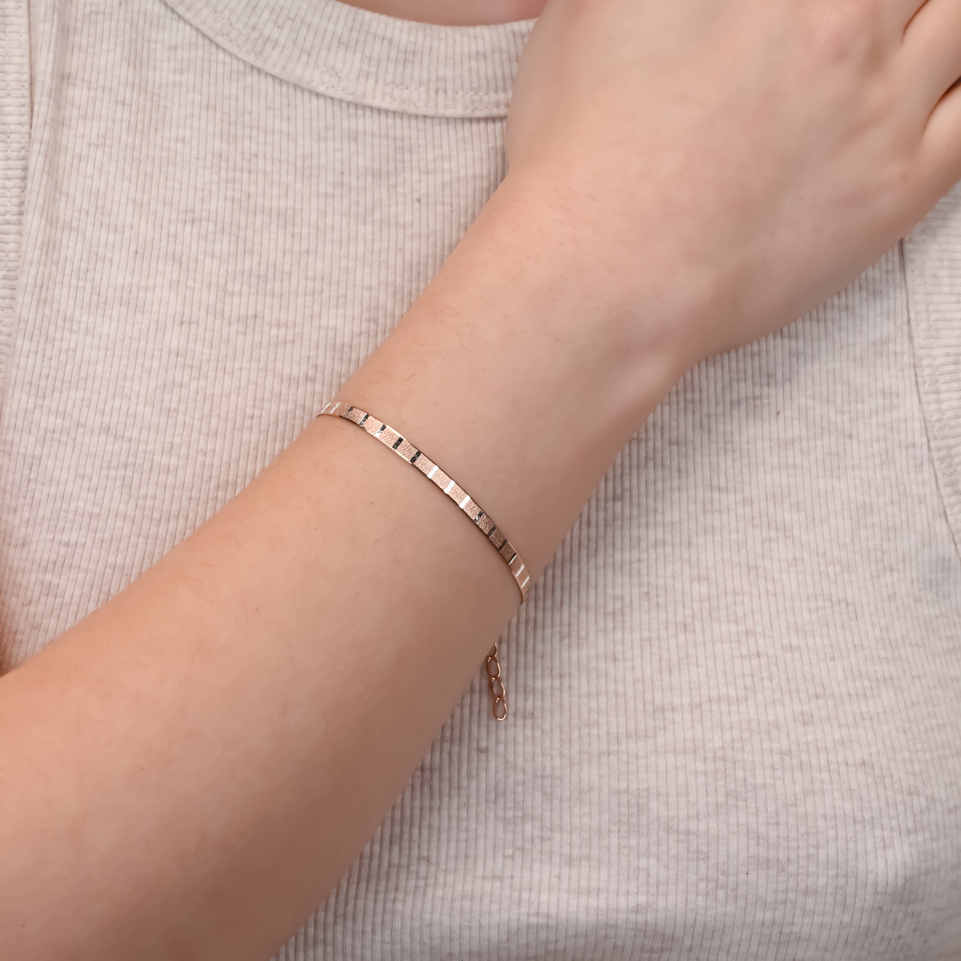 The Herringbone Rose Gold Plated Silver Bracelet is a stunning blend of modern design and timeless elegance. Crafted from sterling silver (925) and plated with 18ct rose gold, this bracelet exudes sophistication and style.
