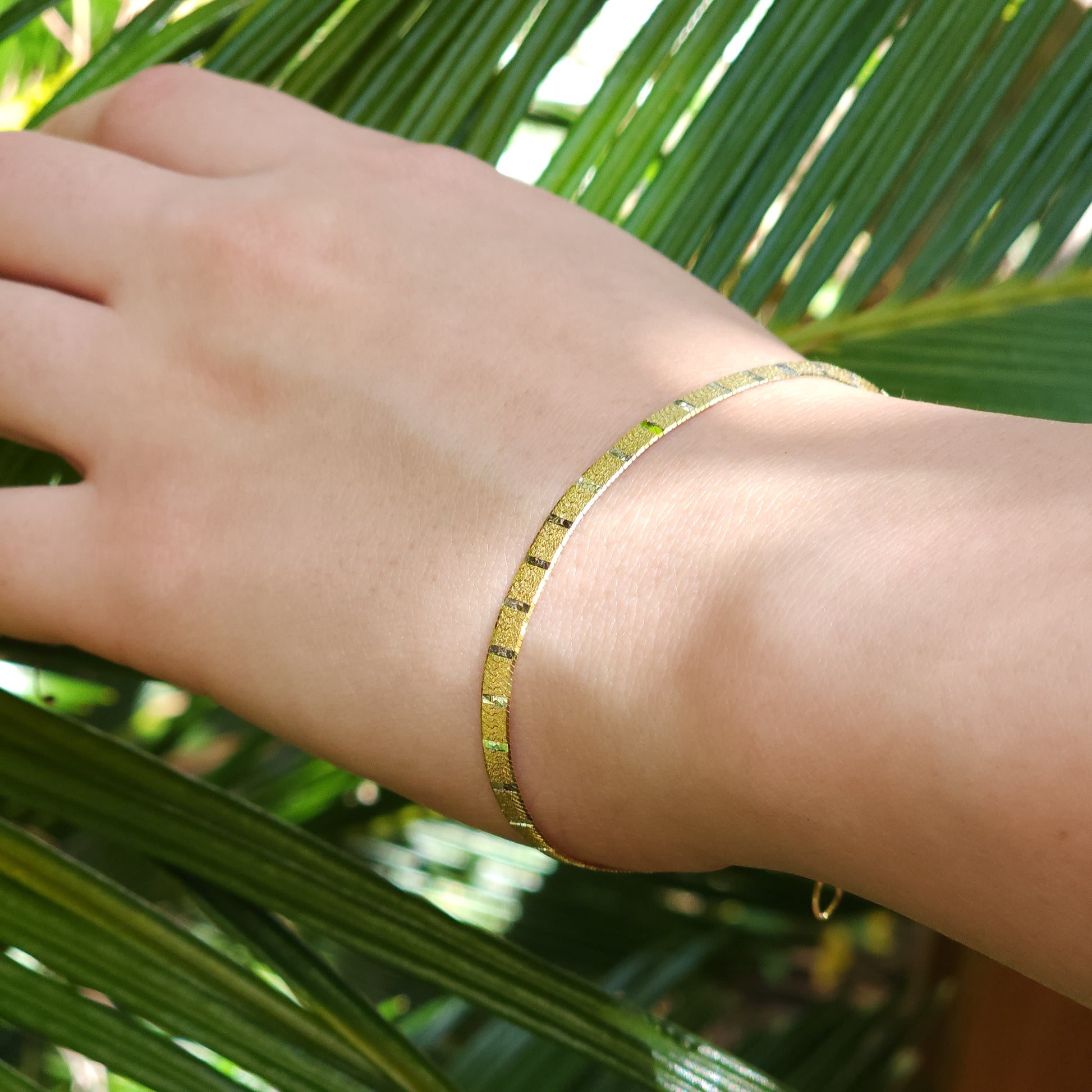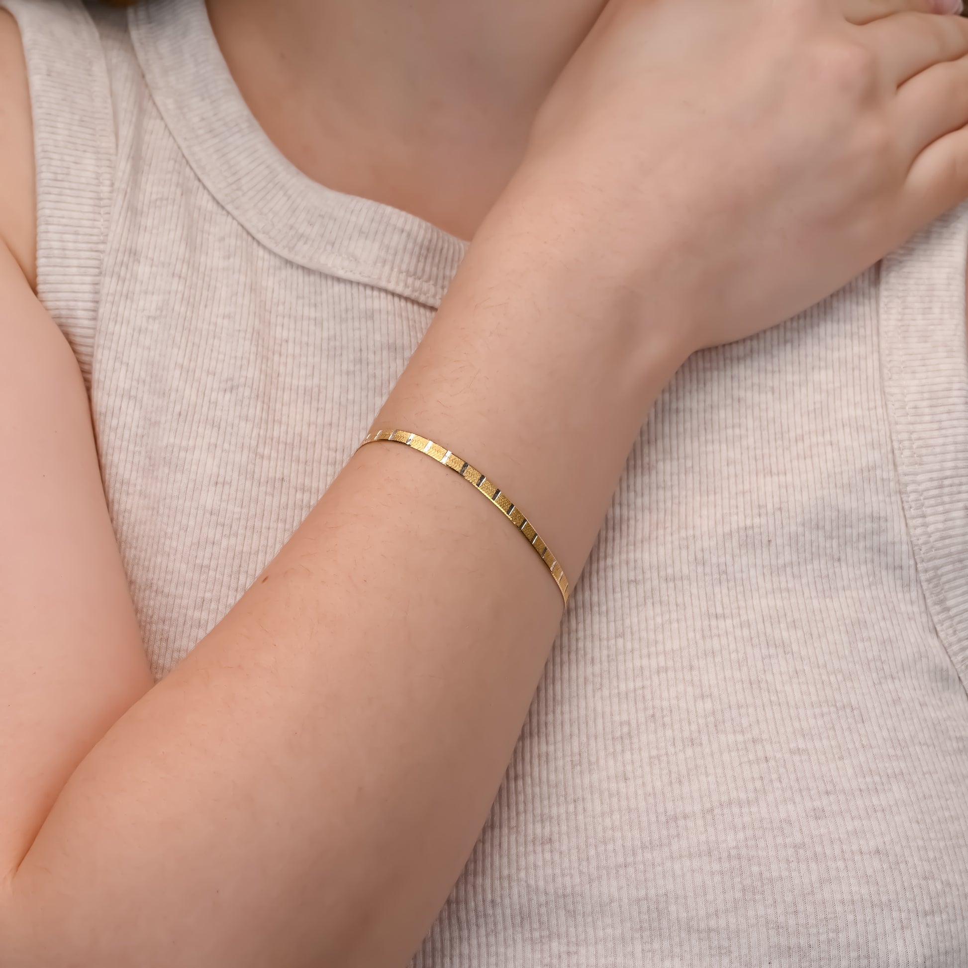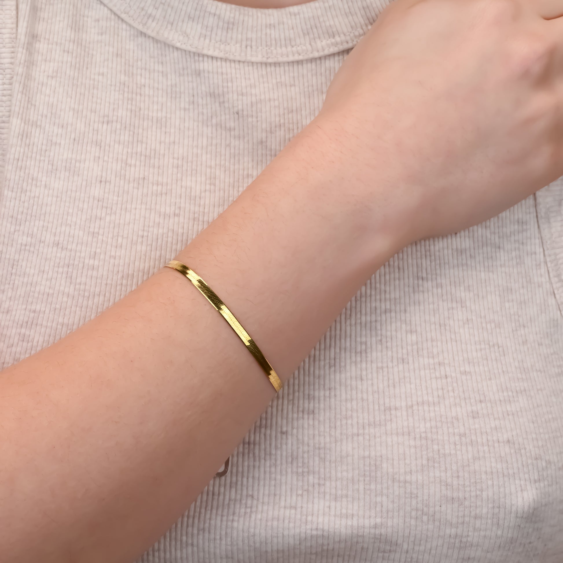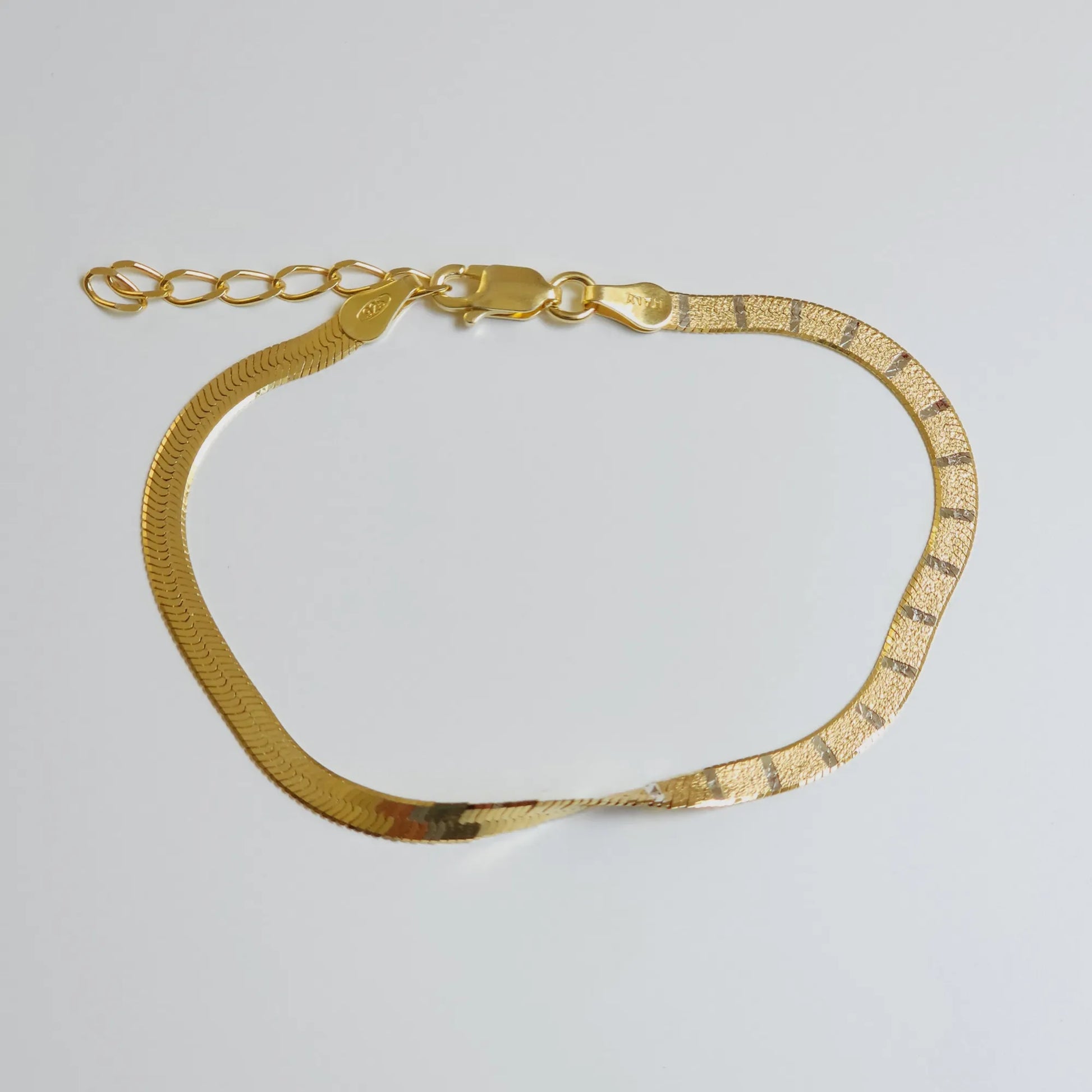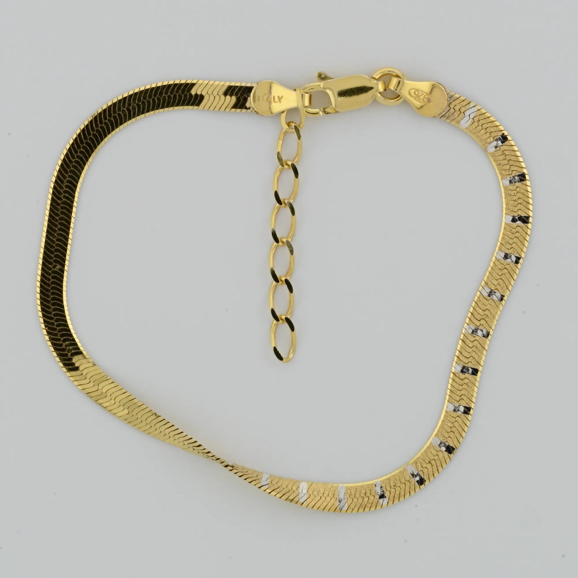 Enhance your jewellery collection with the luxurious elegance of our Herringbone Gold Plated Silver Bracelet. Crafted in Italy from sterling silver 925 and plated with 18ct gold, this bracelet features a sophisticated herringbone design with a link size of 3.4mm, perfect for adding a touch of refinement to any outfit.