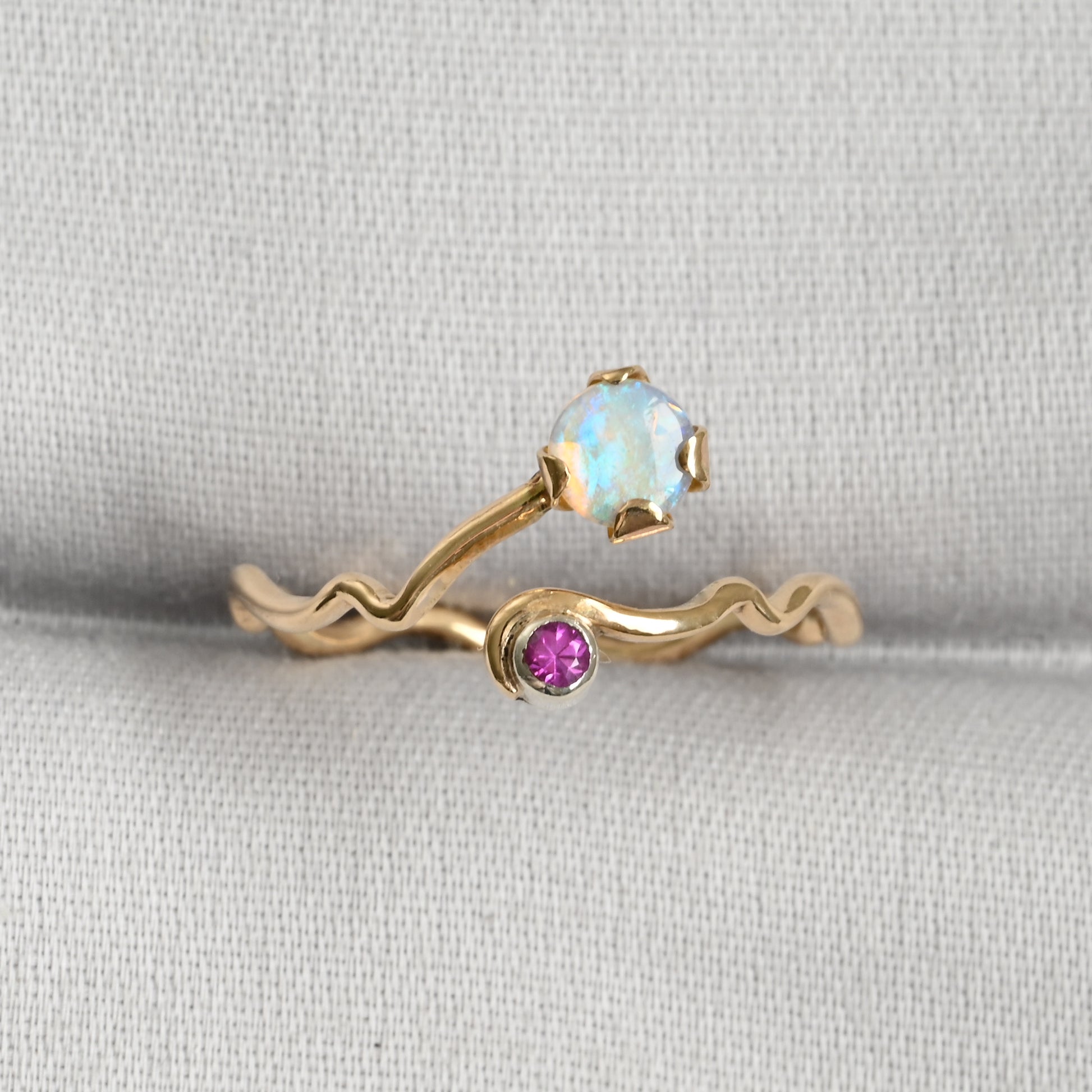 Crystal Opal Wavy Gold Ring with Pink Sapphire