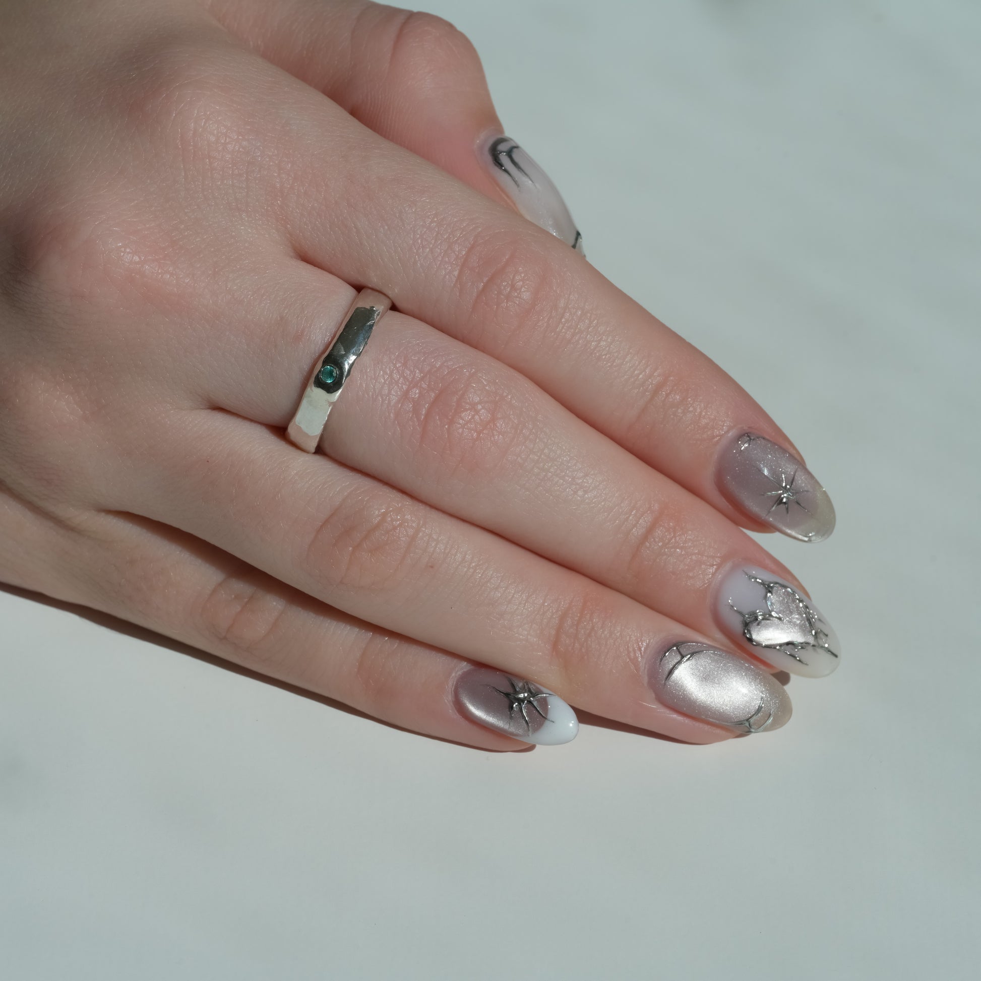 This one is minimalist but textured — clean lines with a subtle organic shape and a single paraiba garnet. It’s quiet but meaningful — feels like something you’d wear every day and grow attached to.