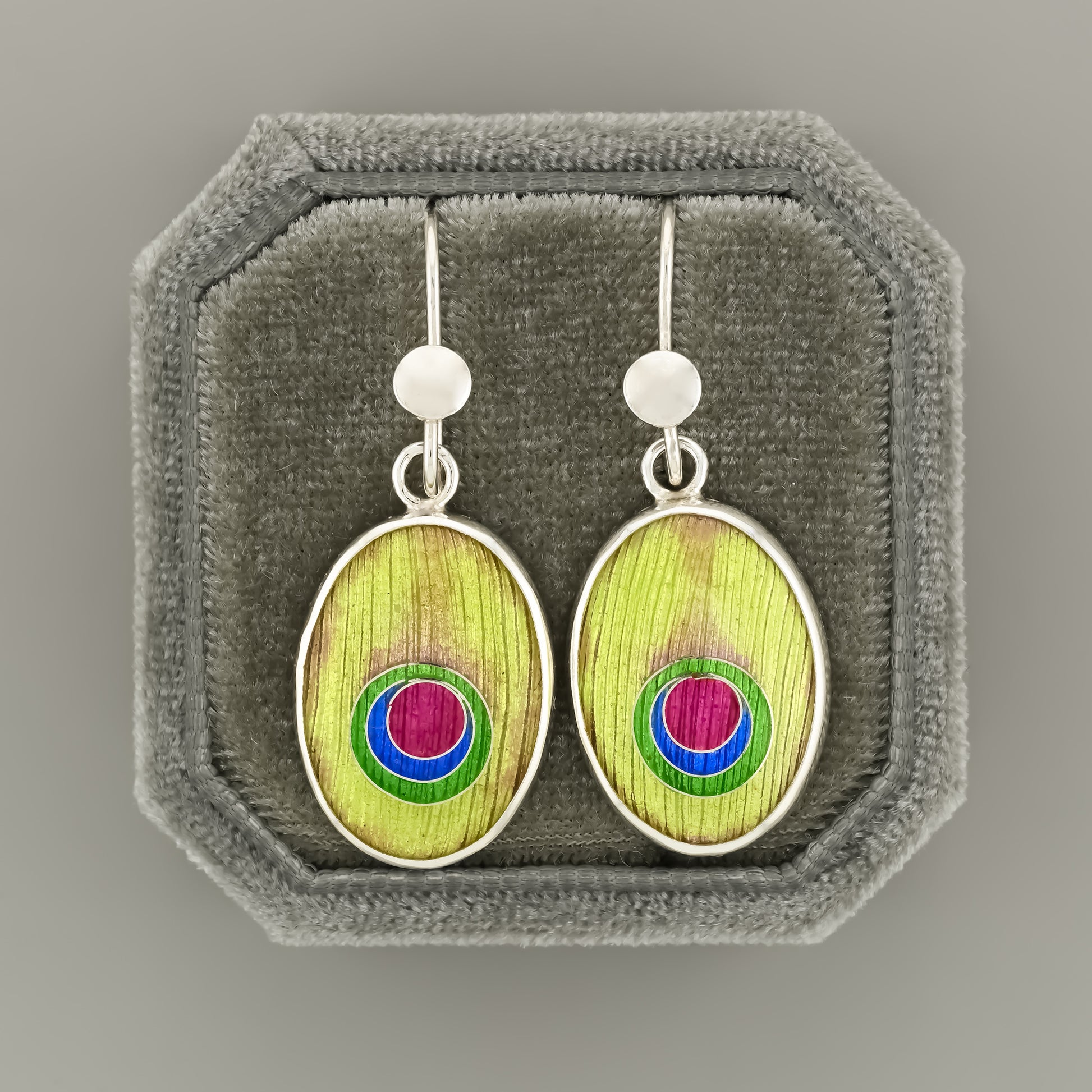Indulge in the stunning elegance of our Peacock Earrings. Handmade in Australia with intricate cloisonné and champlevé techniques on a fine silver (999) base, each pair of earrings is a unique work of art. The vibrant colours and detailed designs capture the beauty of peacock feathers, making these earrings a standout accessory that adds a touch of sophistication and charm to any outfit.