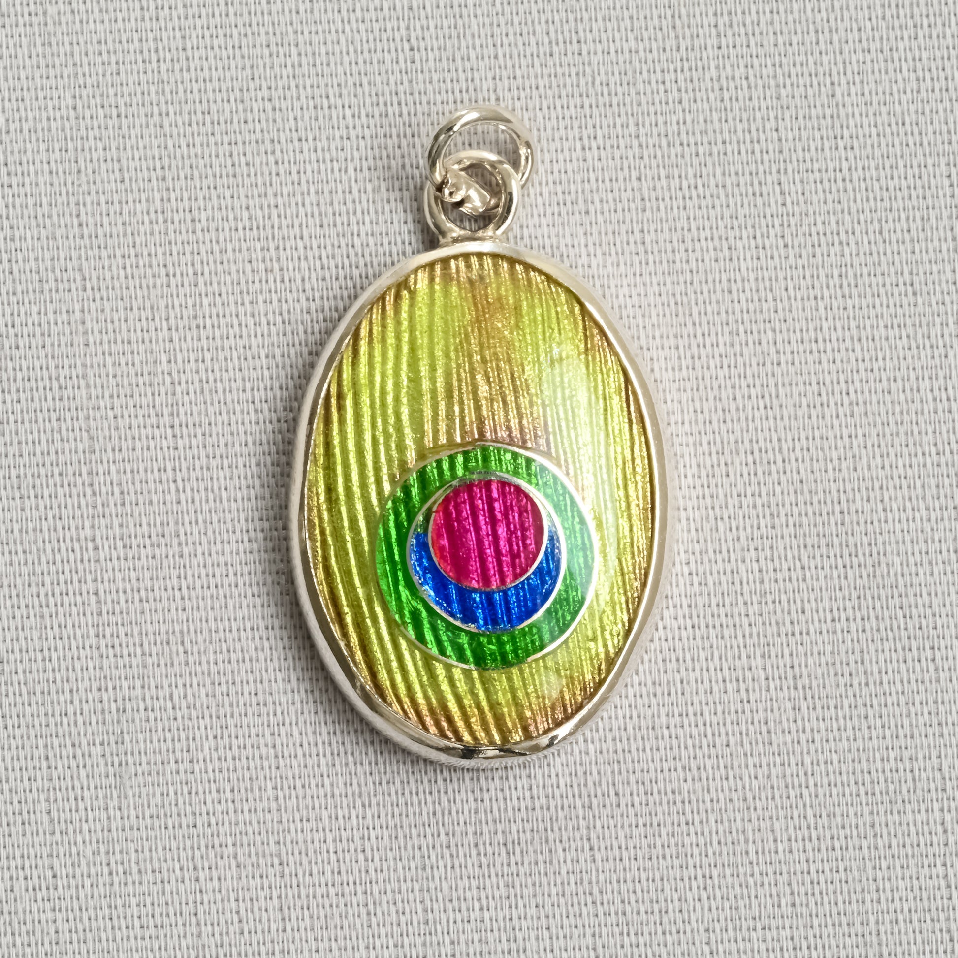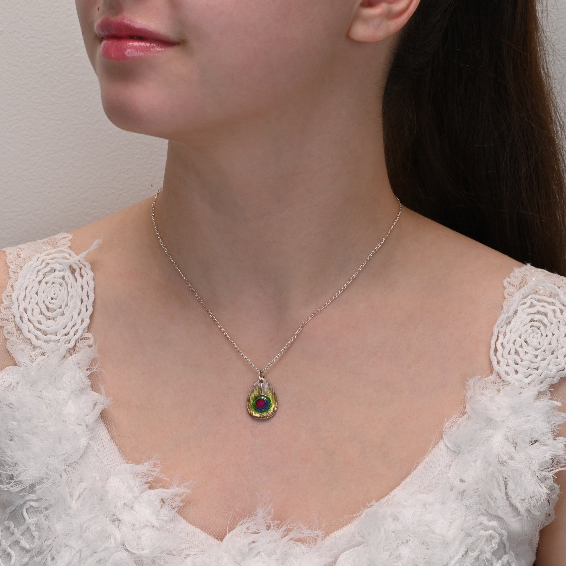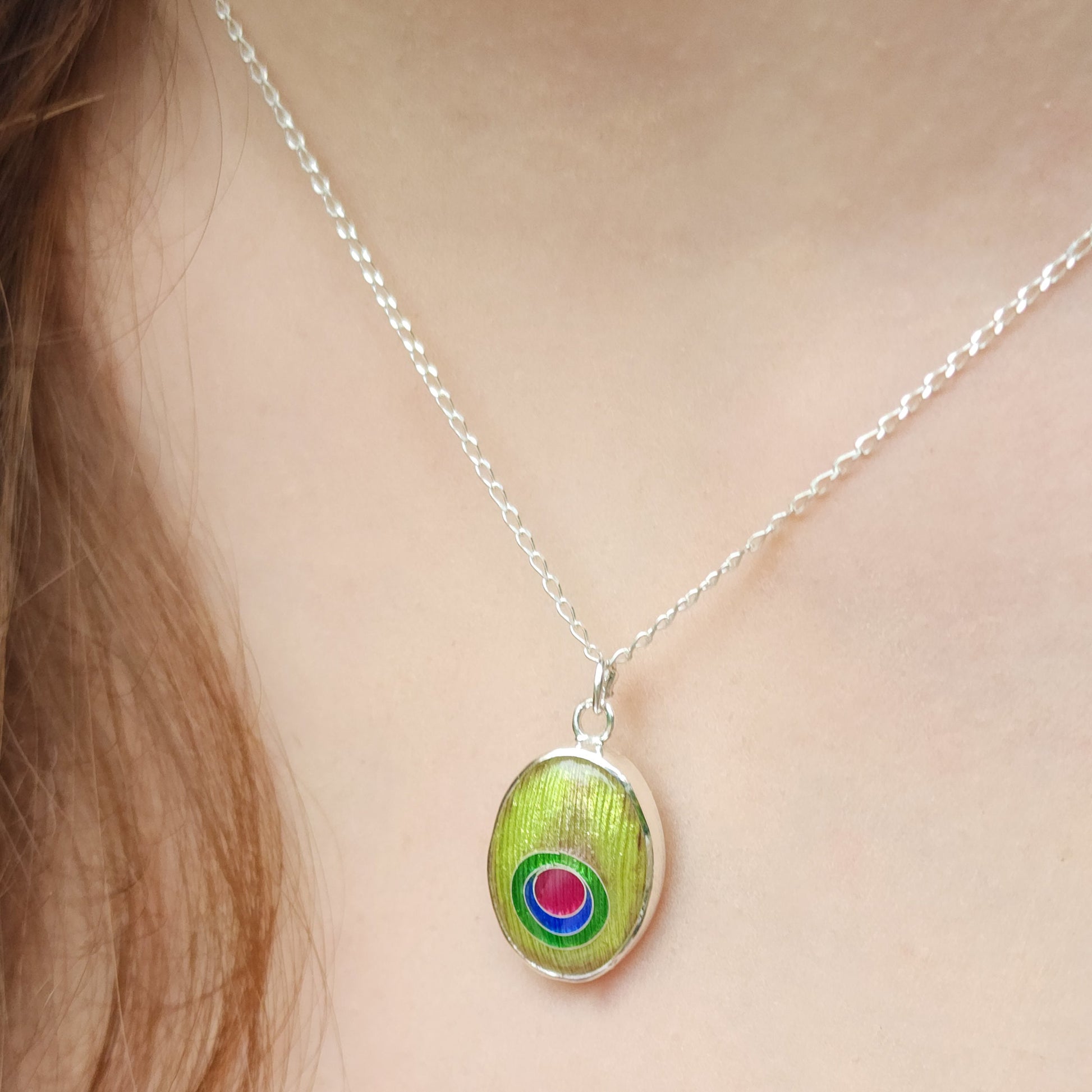 Indulge in the stunning artistry of our "Peacock Pendant". Handmade in Australia with intricate cloisonné and champlevé enamels on a fine silver (999) base, each pendant is a unique work of art. The vibrant colours and detailed design were inspired by a peacock feather. Some people believe that a peacock feather brings good luck.