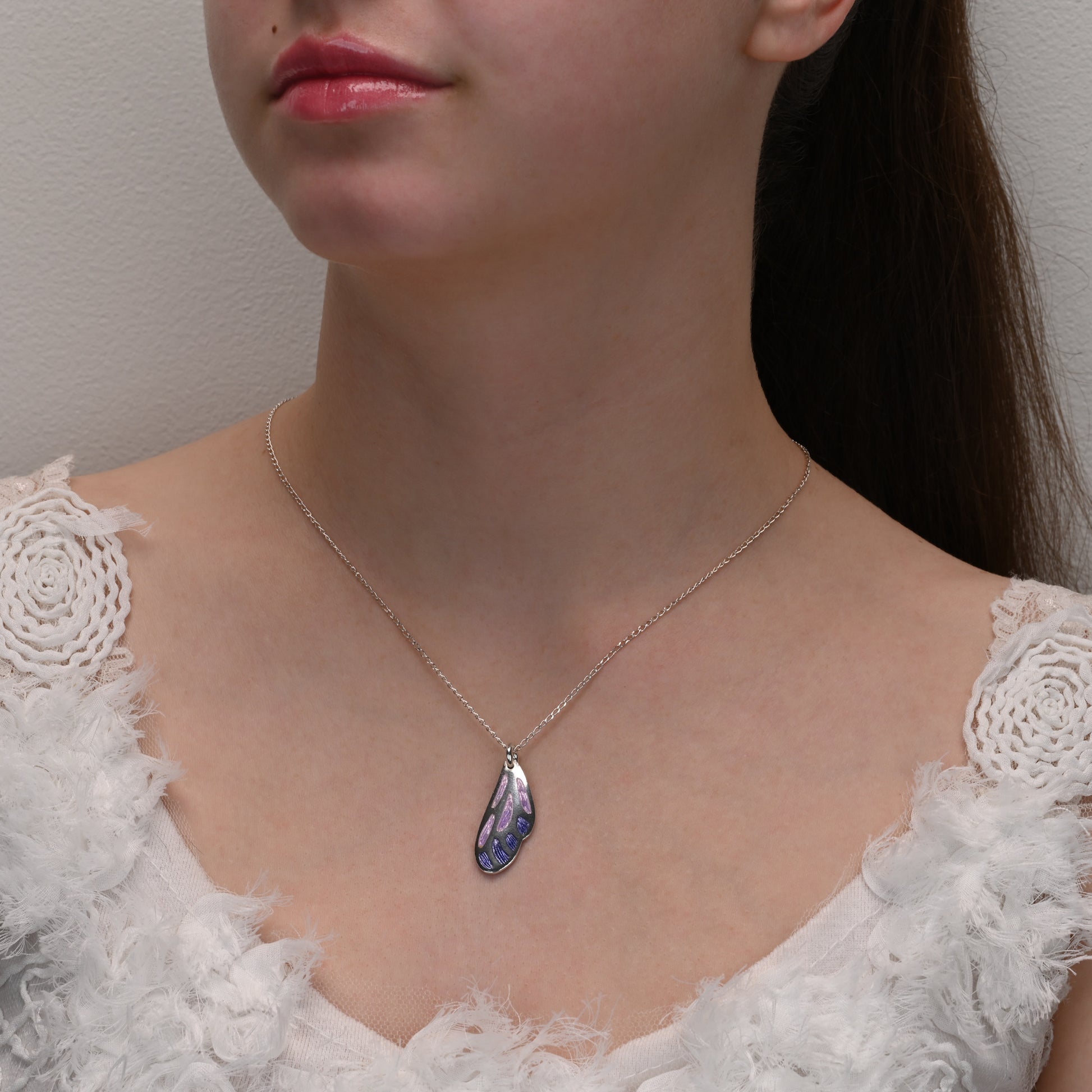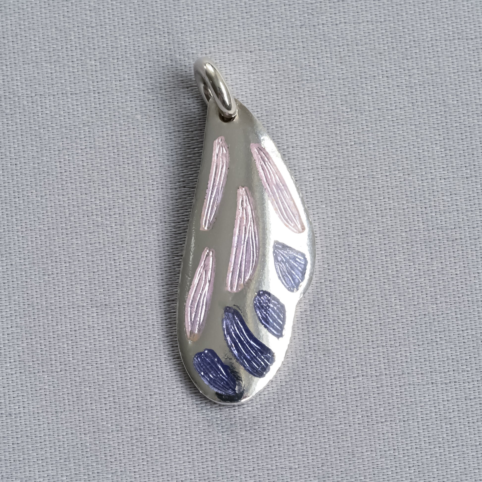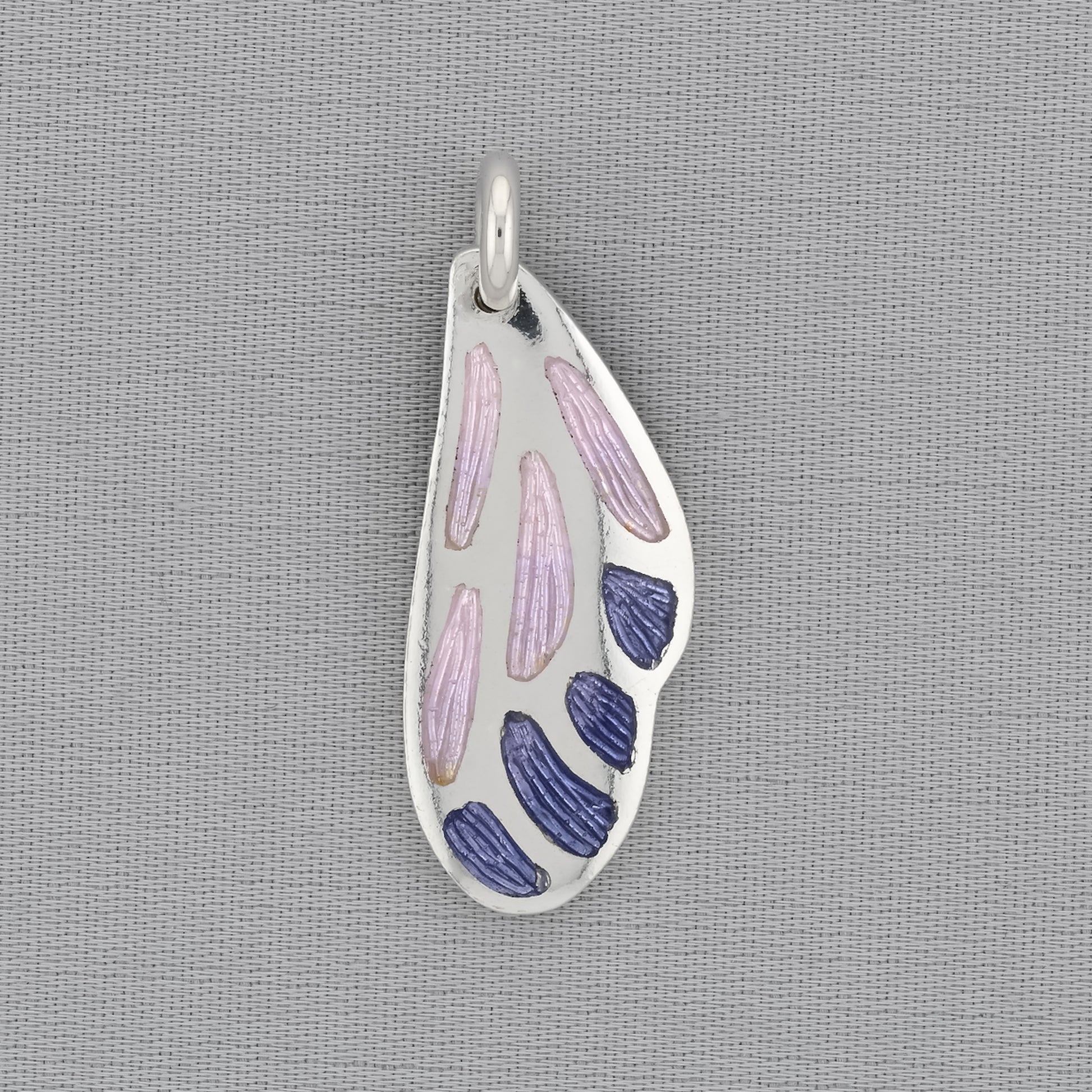 This exquisite "Butterfly Wing Pendant" is a true testament to the art of jewellery making, combining the beauty of nature with meticulous craftsmanship. This pendant is adorned with champlevé vitreous enamels in vibrant shades of pink and purple. The intricate design captures the delicate elegance of a butterfly wing, making it a standout piece that adds a touch of sophistication and colour to any outfit. Whether worn for a special occasion or as an everyday accessory, this pendant is sure to draw admiration and compliments.