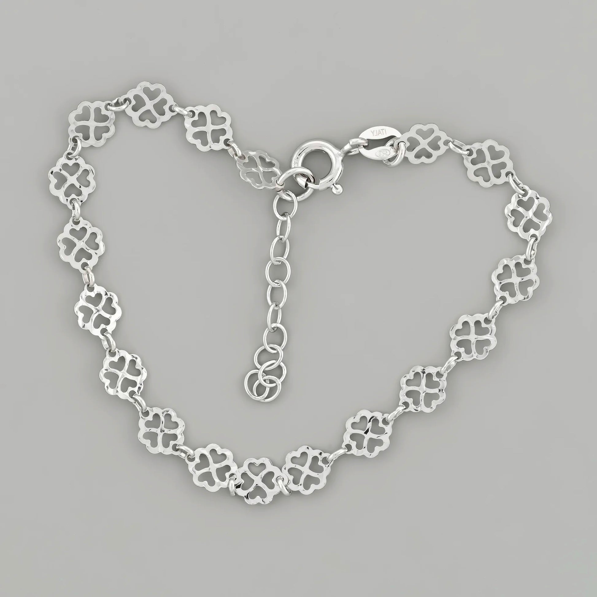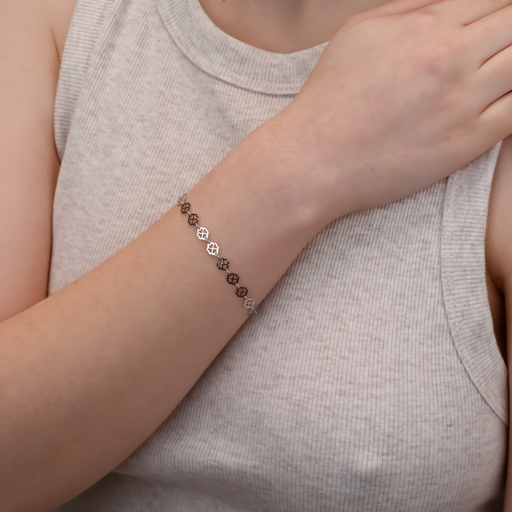 Enhance your jewellery collection with the refined elegance of our Rhodium Plated Clover Silver Bracelet. Crafted in Italy from sterling silver 925 and plated with rhodium for added durability and shine, this bracelet features unique clover-shaped links with a size of 5.3mm, offering a sophisticated and stylish look perfect for any occasion.