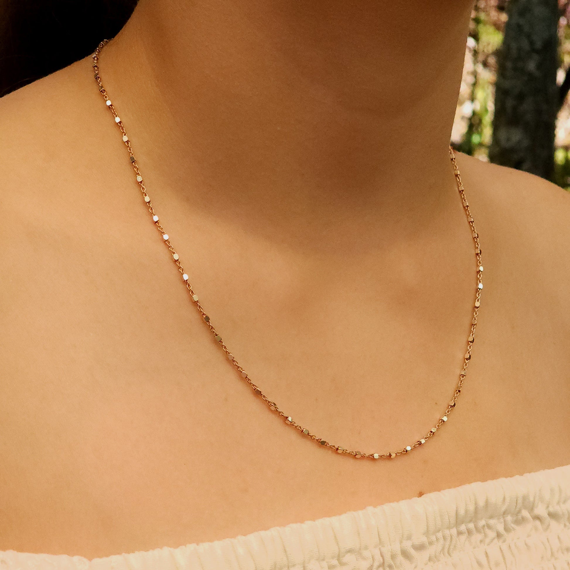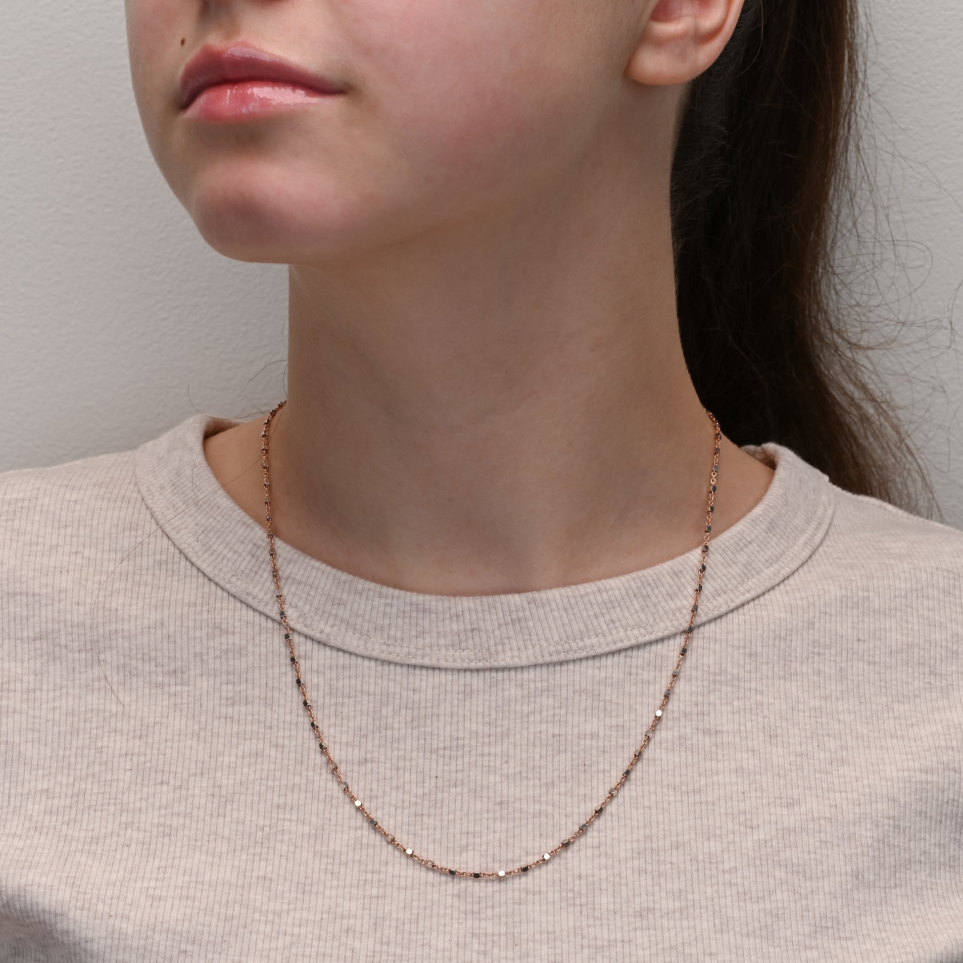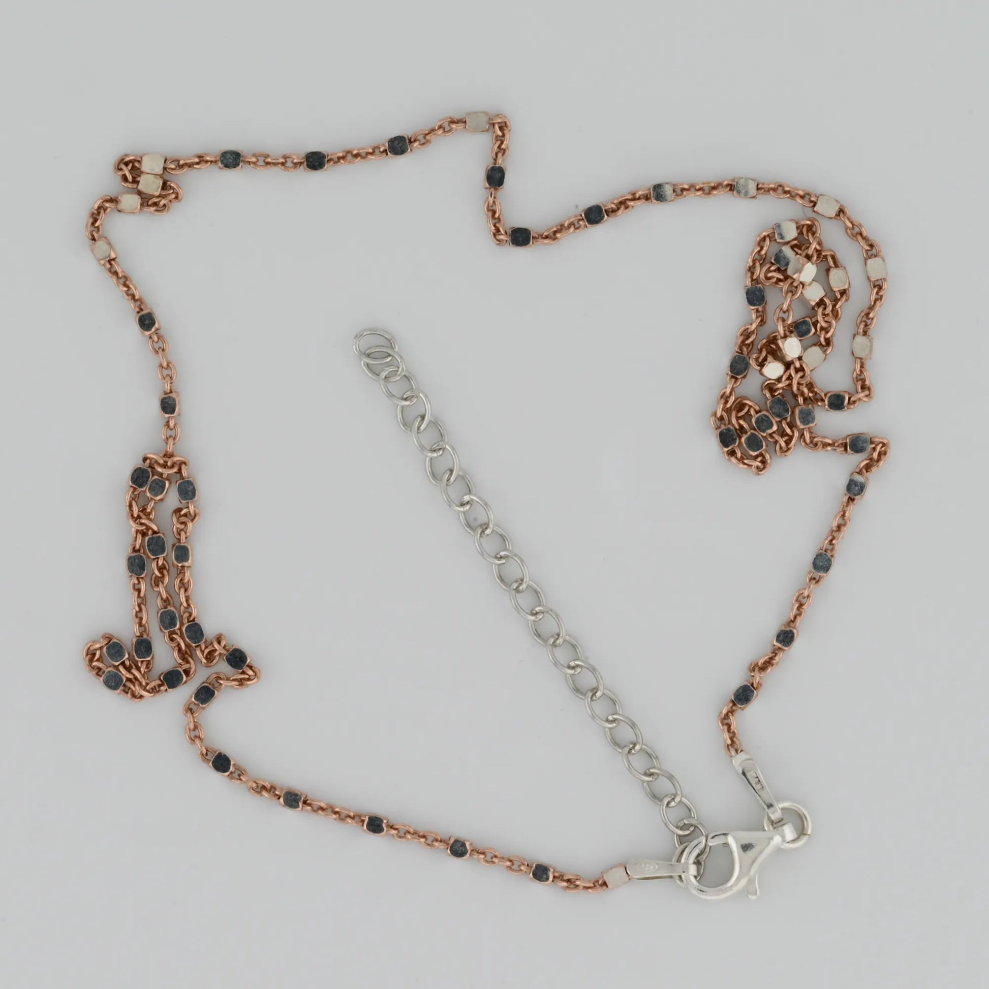 The Rose Gold Chain with Cube Beads is a stunning blend of modern design and timeless elegance. Crafted from sterling silver (925) and plated with 18ct rose gold, this chain features delicate cube beads, adding a touch of sophistication to any outfit.
