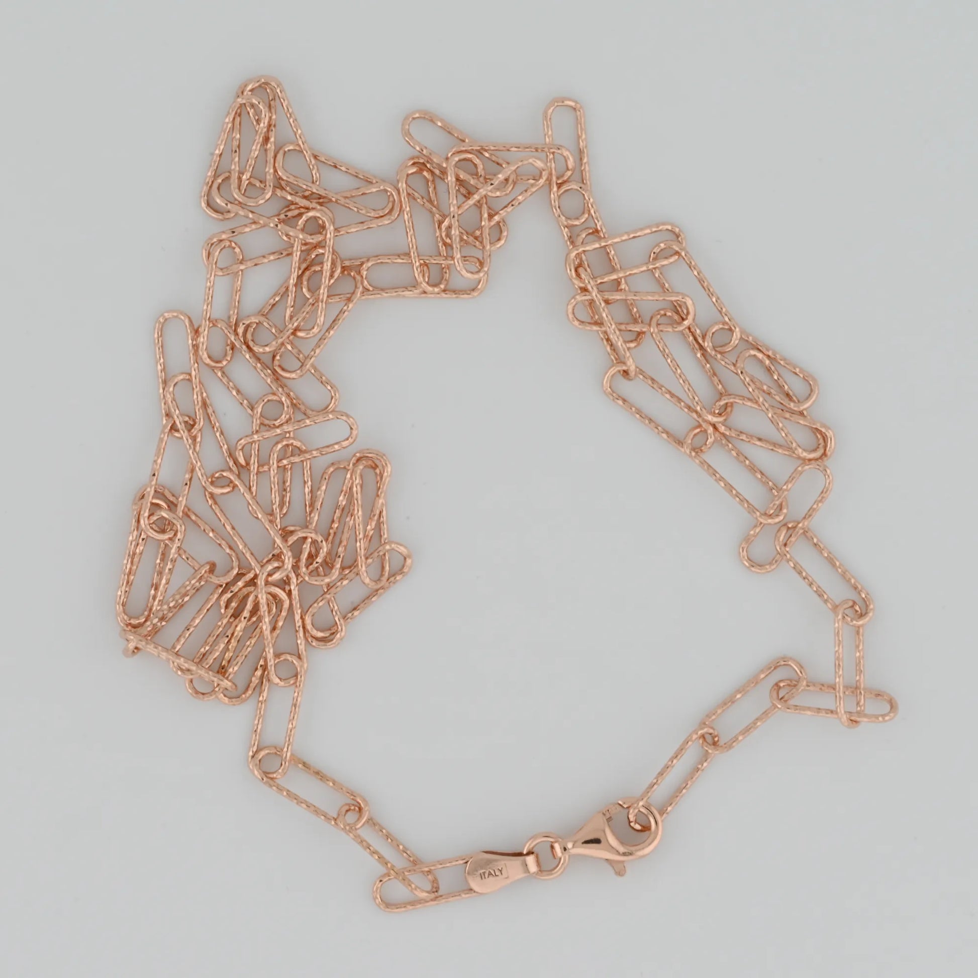 The Rose Gold Sparkly Paperclip Silver Chain showcases a perfect blend of contemporary style and classic elegance. This exquisite chain is meticulously crafted from sterling silver (925) and plated with 18ct rose gold and rhodium, radiating luxury and refinement in every aspect.
