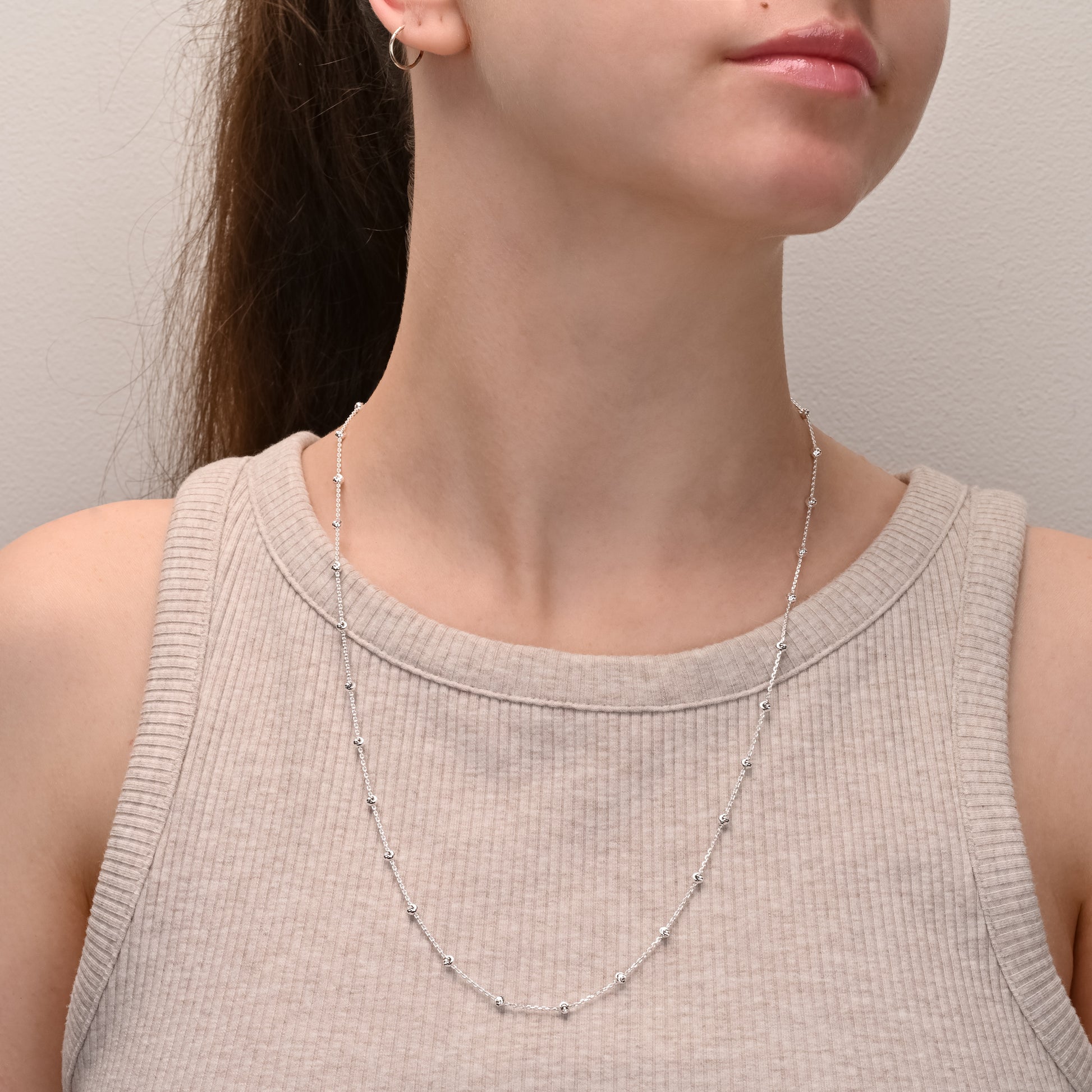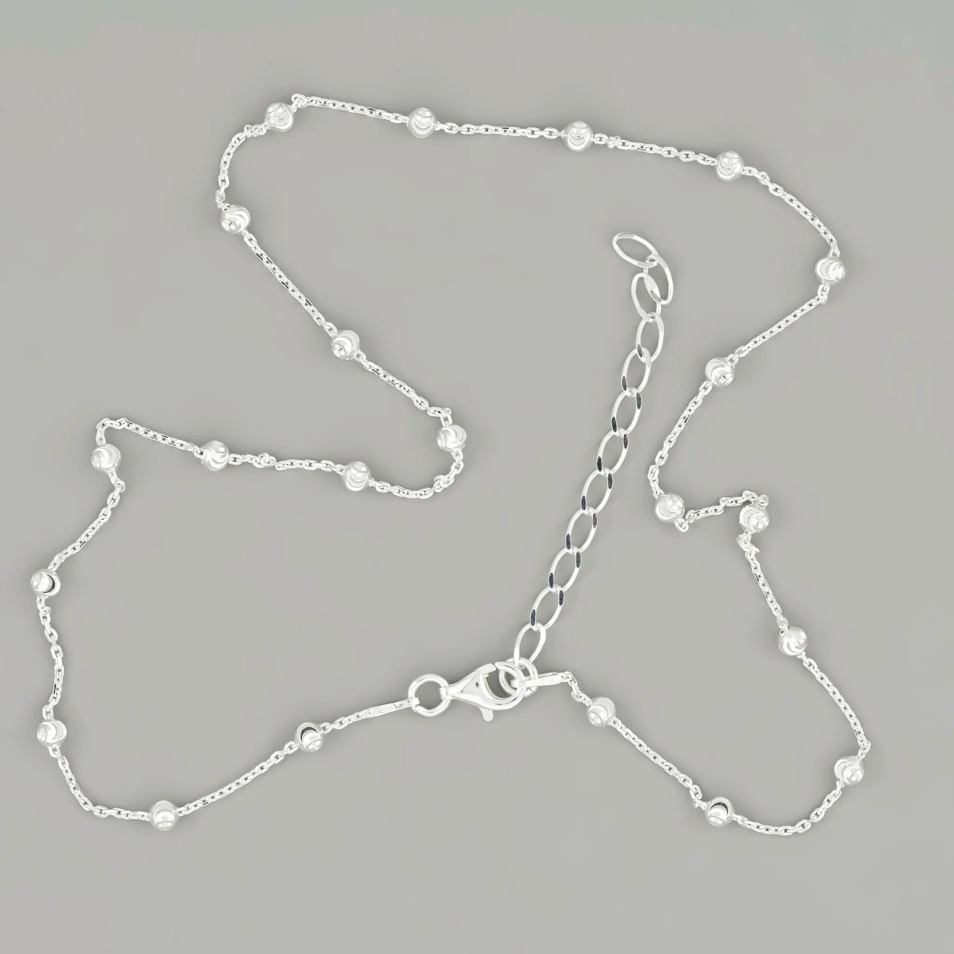 Enhance your jewellery collection with the delicate charm of our Silver Chain With Round Beads. Crafted in Italy from sterling silver 925, this chain features elegant links with a size of 0.85mm and is adorned with small round beads, offering a refined and sophisticated look perfect for any occasion.
