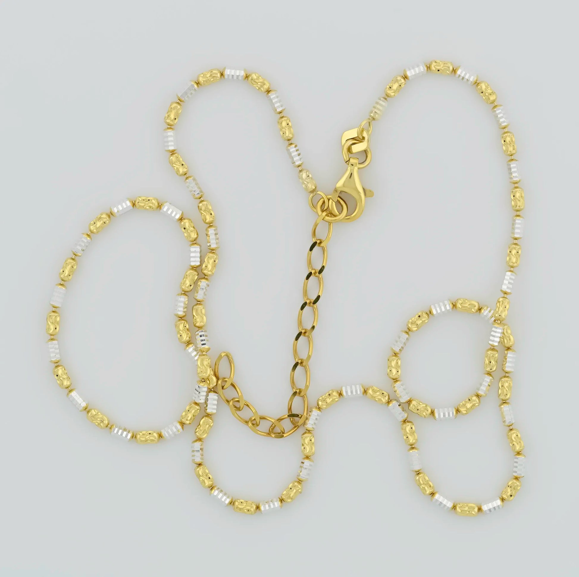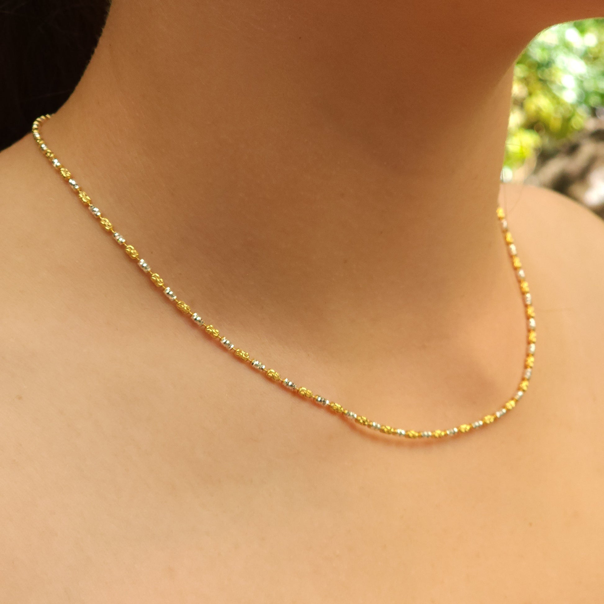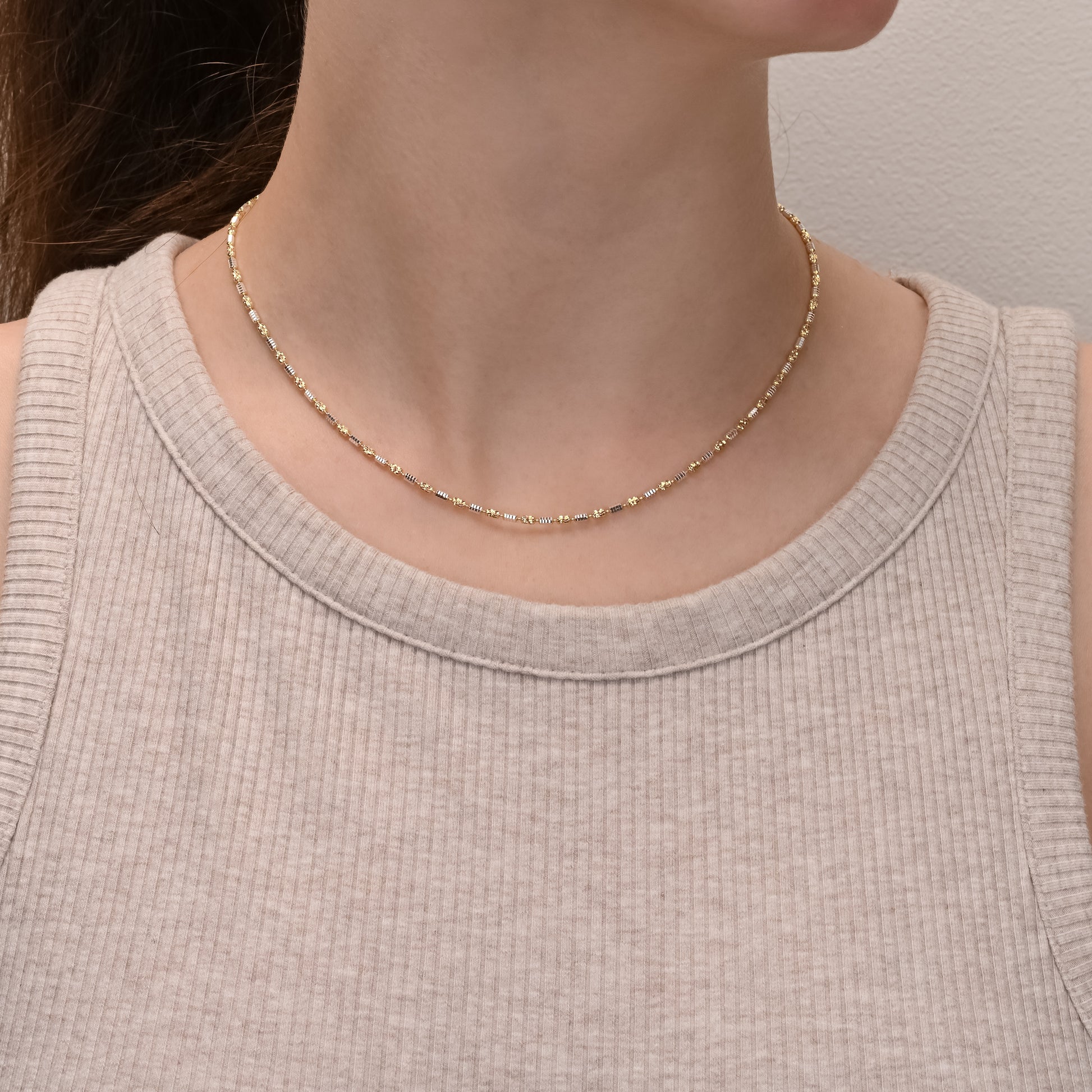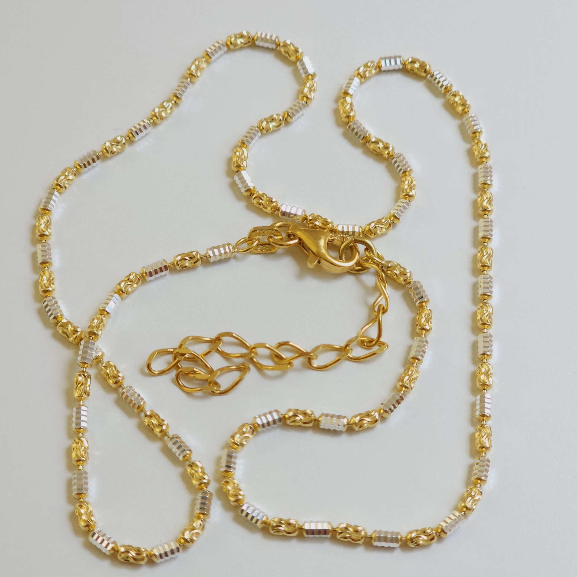 Introduce a touch of elegance to your jewellery collection with our Yellow Gold & Rhodium Beaded Silver Chain. Expertly crafted in Italy from sterling silver 925, this chain features a stunning combination of 18ct gold and rhodium plating. The delicate beaded links, with a size of 1.9mm, provide a sophisticated and versatile look perfect for any occasion.