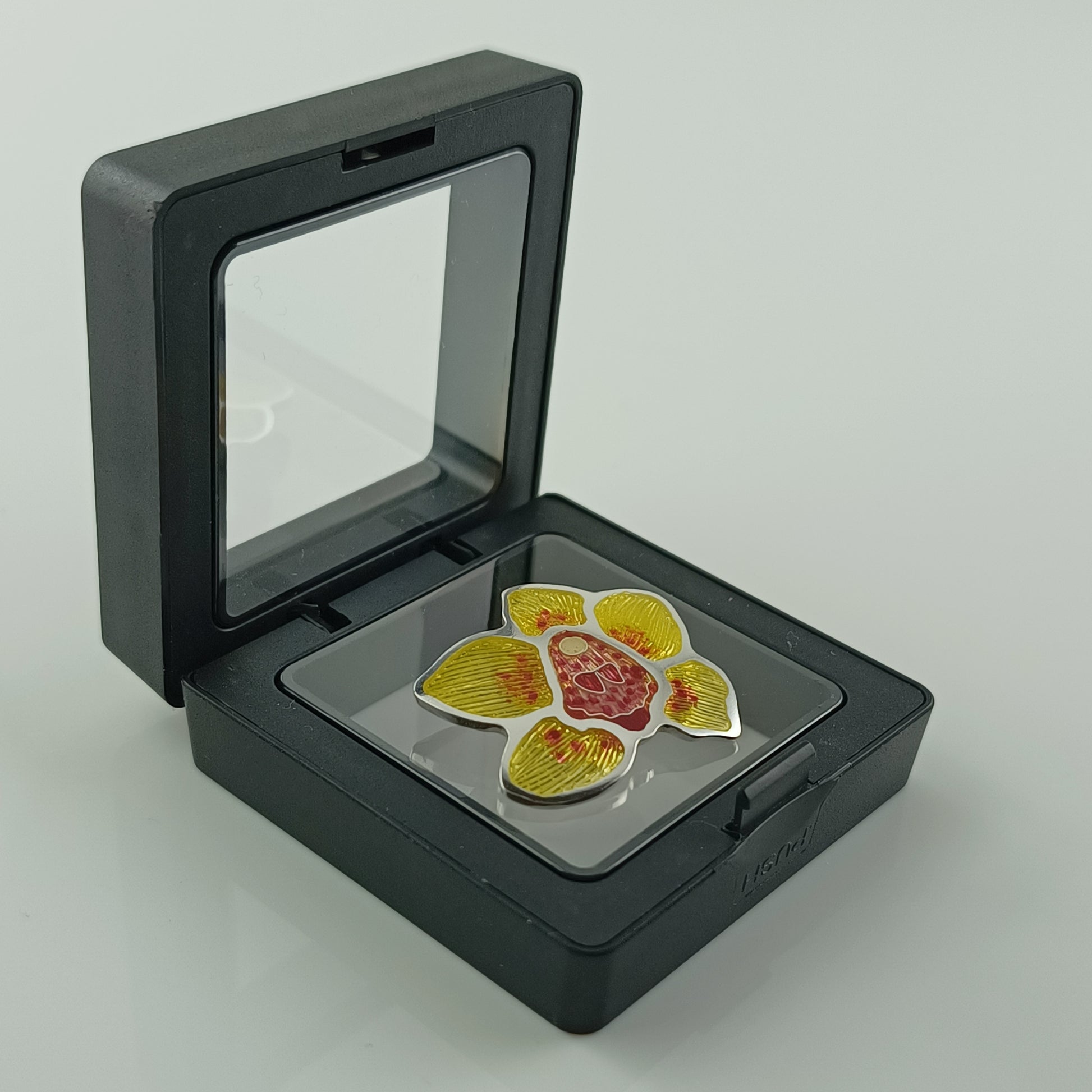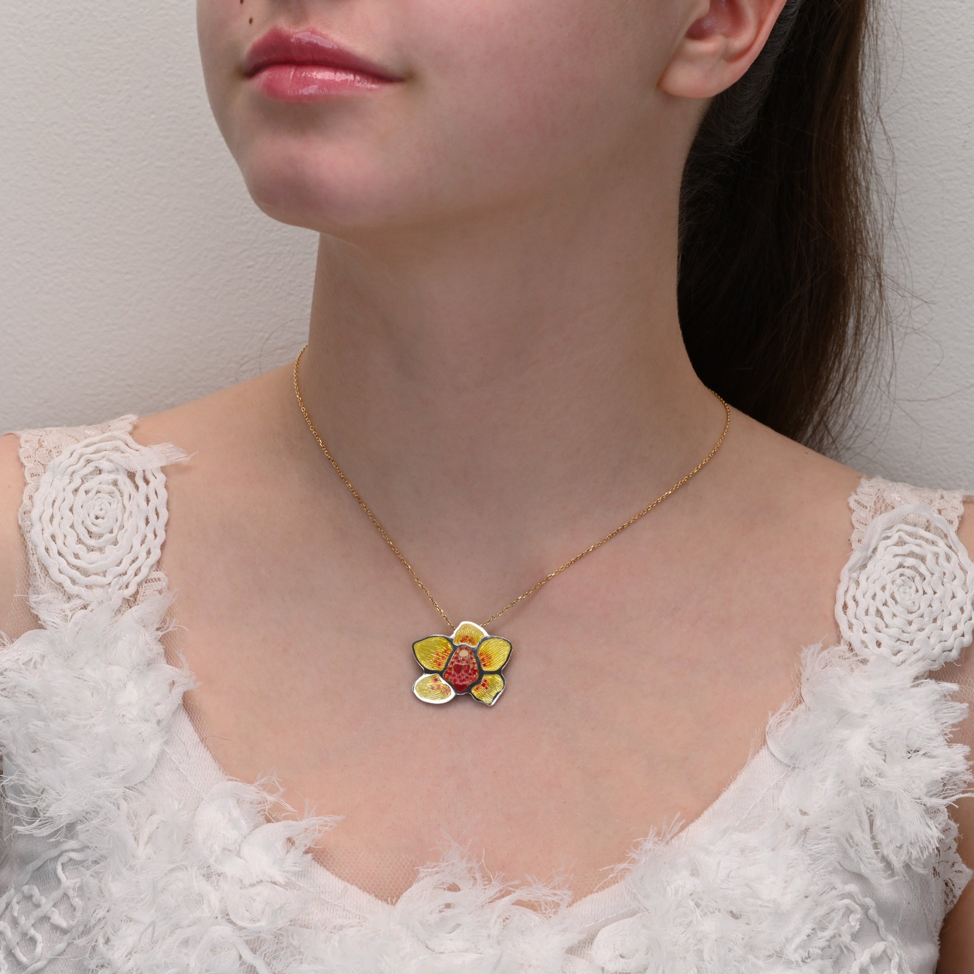 The "Yellow Orchid Pendant" is a captivating piece of design and craftsmanship. This pendant showcases the champlevé technique, where fine lines are carved into the silver base and filled with luminous vitreous enamel to create a stunning yellow orchid.
